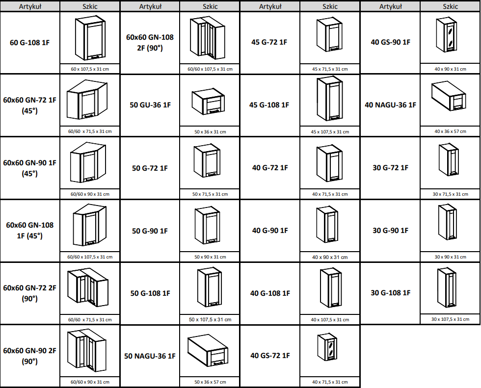 - szafki sprzedawane w paczkach wraz z czytelną instrukcją montażu oraz wszystkimi potrzebnymi okuciami,