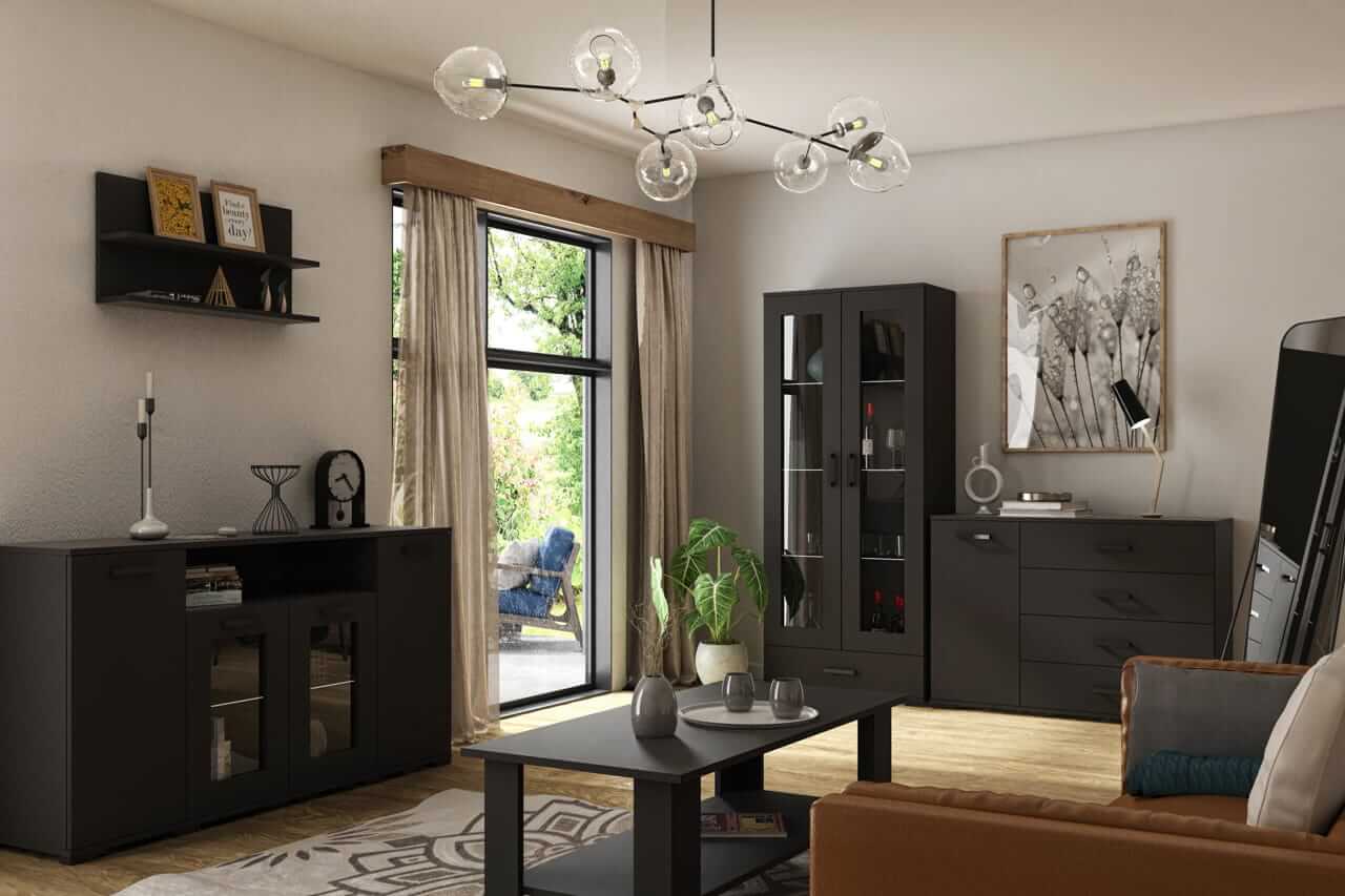 - Praktyczne rozwiązania – pojemne szafki, witryny z przeszkleniami oraz funkcjonalne stoliki kawowe sprawdzą się w codziennym użytkowaniu.