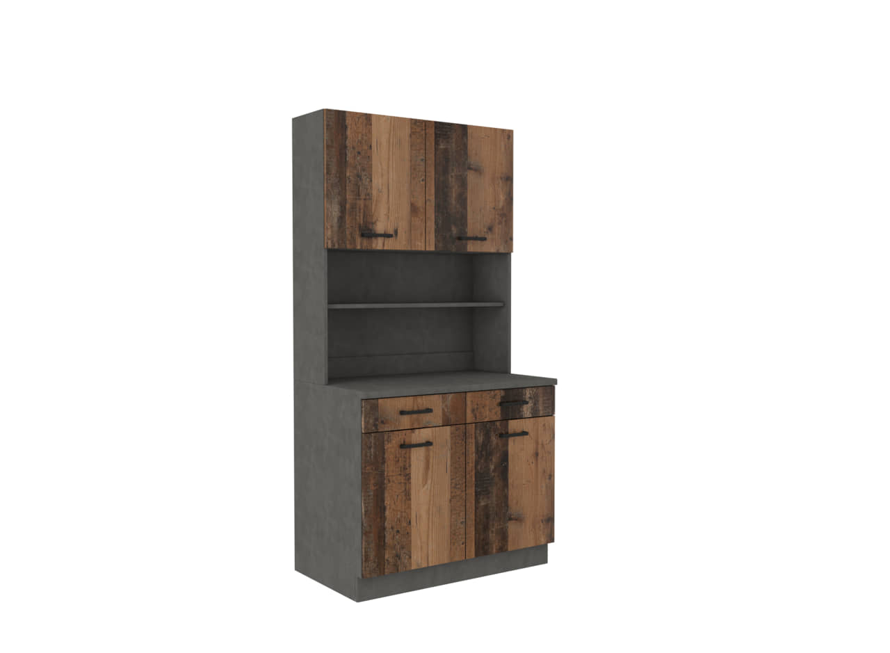 Zestaw w tej ofercie obejmuje kredens o szerokości 100cm oraz szafkę kominową o szerokości 50cm.