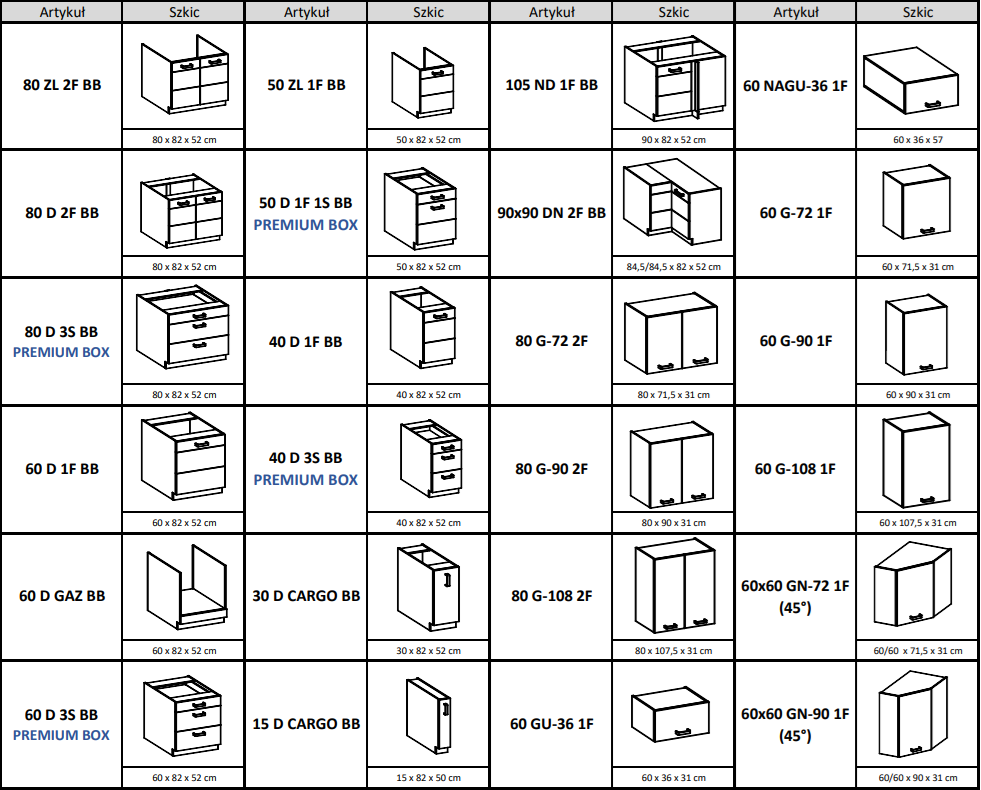 Pozostałe szafki kuchni Artisan biały połysk wraz z wymiarami: