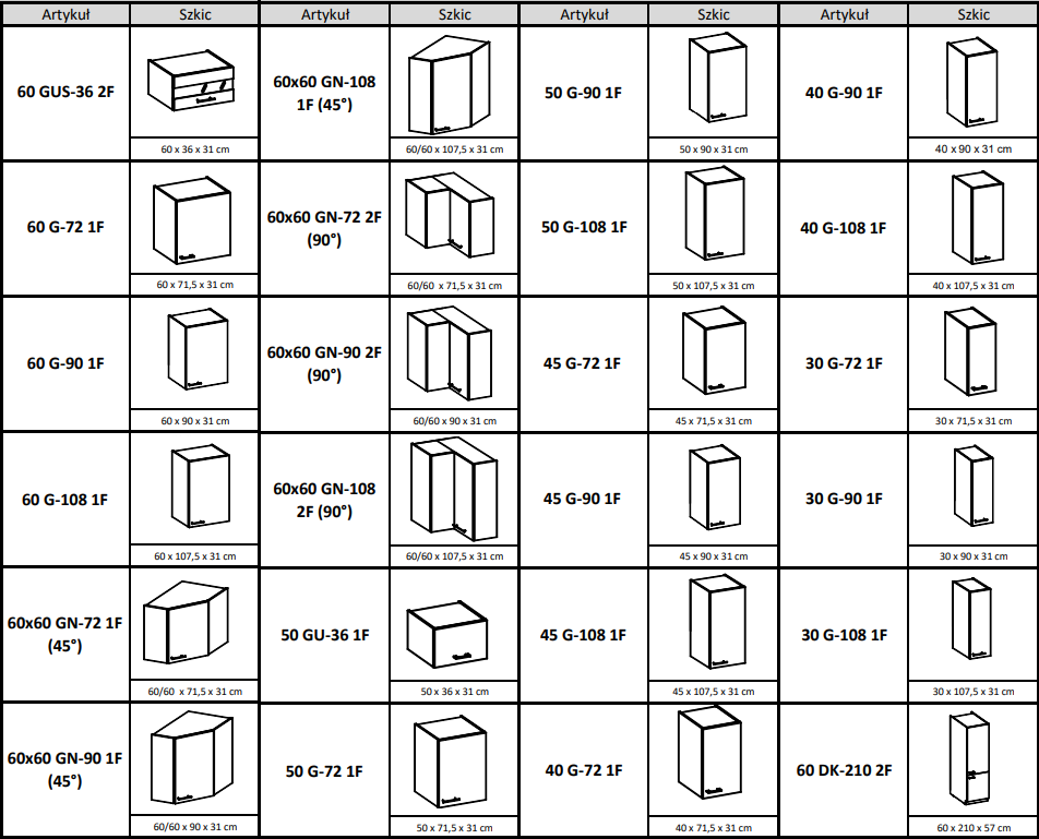 - szafki sprzedawane w paczkach wraz z czytelną instrukcją montażu oraz wszystkimi potrzebnymi okuciami,