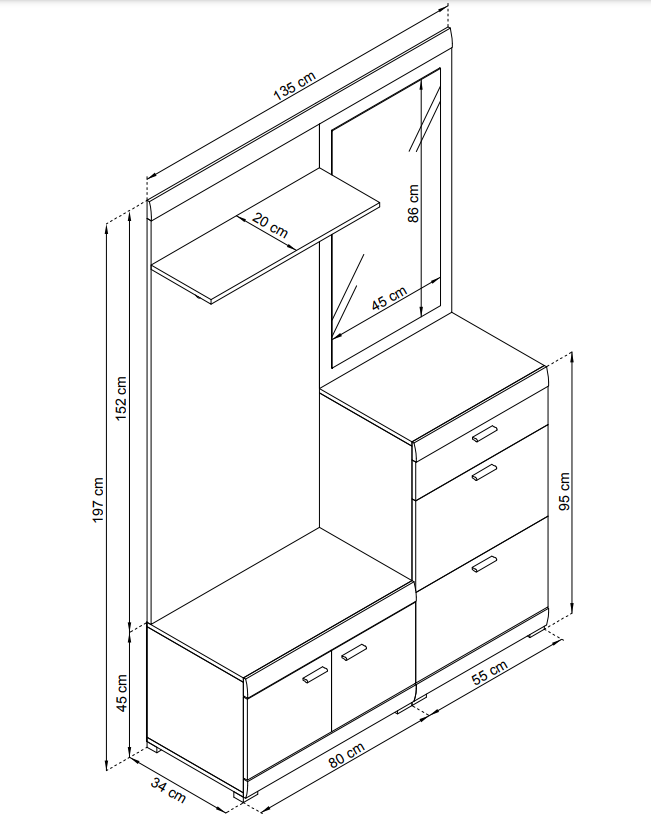 Funkcjonalna i pojemna garderoba to podstawowy element każdego przedpokoju. W skład garderoby Stella wchodzi: szafka niska, szafka wysoka, lustro, panel z wieszakiem i półką.