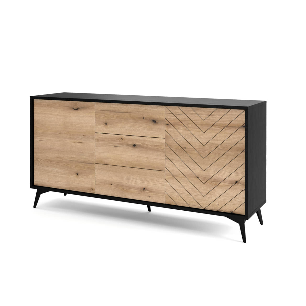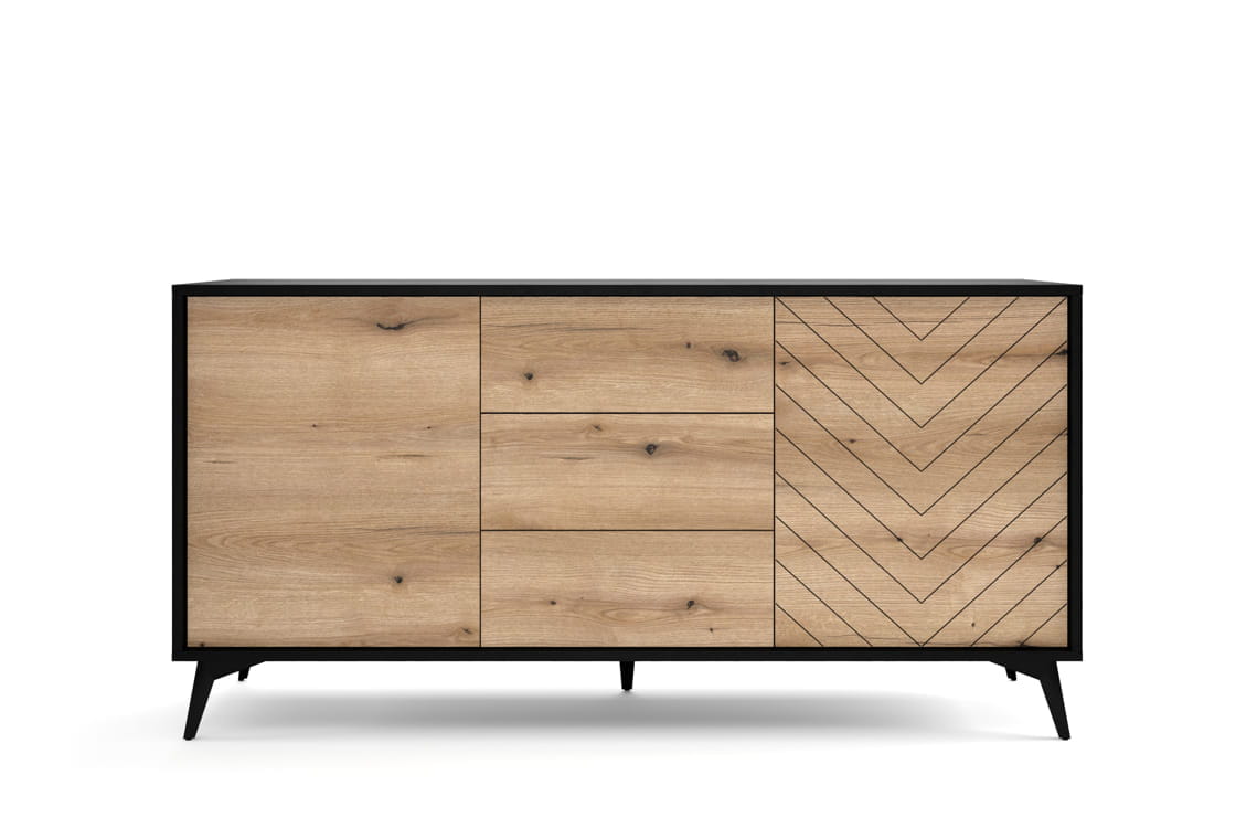 Diamond to system mebli wykonany w stylu skandynawskim. Połączenie czerni wraz z odcieniem dębu - evoke wpisuje się w aktualne trendy. Szczególną uwagę zwraca frezowany front z ozdobnym wzorem w jodełkę. Diamond charakteryzuje się metalowymi nóżkami, intrygującą kolorystyką, frezowanym frontem oraz systemem push-to-open, dzięki któremu konstrukcja nie potrzebuje uchwytów. Komoda KSZ154 wyposażona została w trzy szuflady oraz dwa uchylne front.