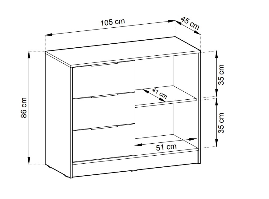 Komoda grafitowa z połyskiem oferuje maksymalną pojemność, dzięki trzem przestronnym szufladom oraz jednej szafce. Nelly wyposażona została w tradycyjne drzwi uchylne. Szuflady poruszają się na wysokiej jakości prowadnicach, zapewniając płynne i ciche wysuwanie nawet przy pełnym obciążeniu. To praktyczne rozwiązanie do przechowywania bielizny, tekstyliów, dokumentów czy akcesoriów codziennego użytku. Metalowe uchwyty malowane na czarno nie tylko ułatwiają otwieranie, ale również podkreślają nowoczesny charakter mebla.