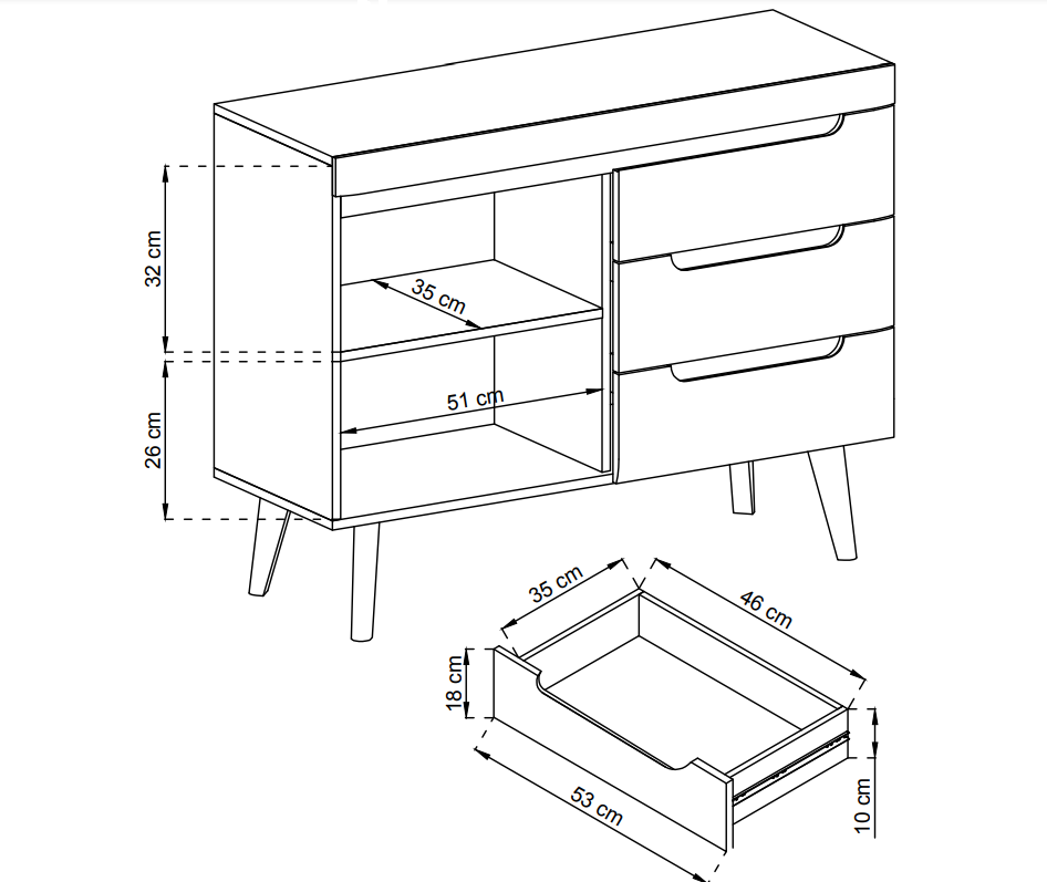 - Korpus: płyta laminowana 16 mm / Front: płyta MDF w wysokim połysku.
