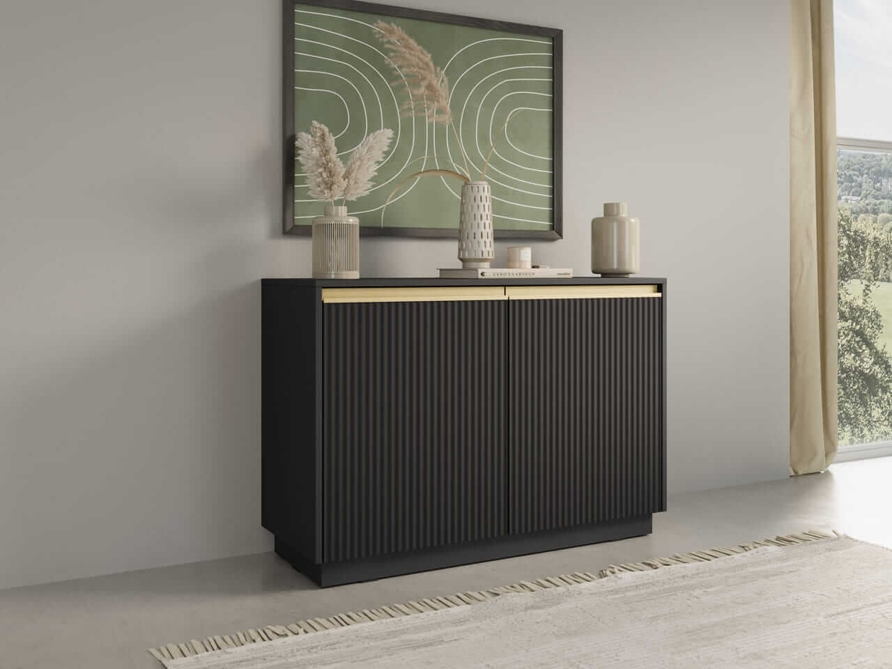 Kolekcja mebli Royal to wyjątkowe połączenie nowoczesnego designu i funkcjonalności, które doskonale wpisuje się w potrzeby współczesnych wnętrz. Ciemna kolorystyka mebli z czarnym wykończeniem oraz subtelne, pionowe żłobienia dodają elegancji i lekkości całej aranżacji. Złote akcenty podkreślają prestiżowy charakter kolekcji, a minimalistyczny wygląd sprawia, że meble świetnie komponują się zarówno w nowoczesnych, jak i klasycznych przestrzeniach.