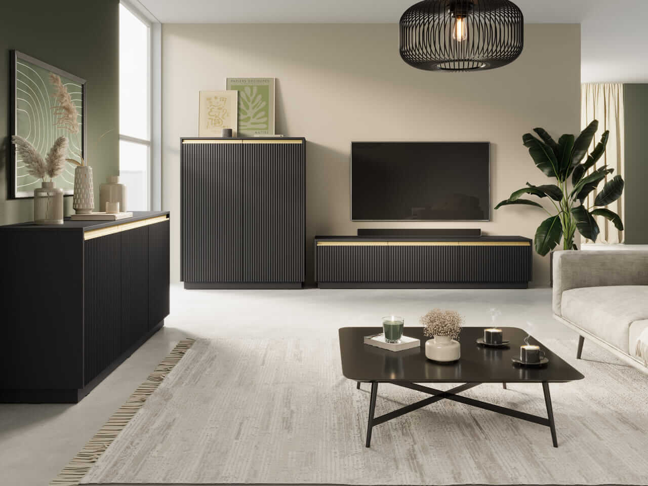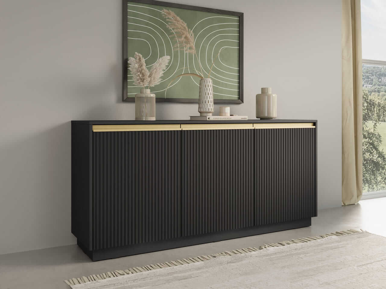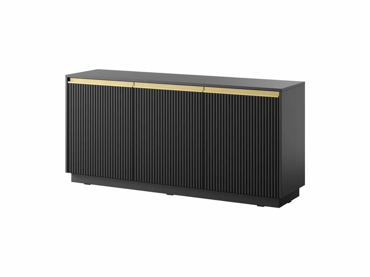 Kolekcja mebli Royal to wyjątkowe połączenie nowoczesnego designu i funkcjonalności, które doskonale wpisuje się w potrzeby współczesnych wnętrz. Ciemna kolorystyka mebli z czarnym wykończeniem oraz subtelne, pionowe żłobienia dodają elegancji i lekkości całej aranżacji. Złote akcenty podkreślają prestiżowy charakter kolekcji, a minimalistyczny wygląd sprawia, że meble świetnie komponują się zarówno w nowoczesnych, jak i klasycznych przestrzeniach.