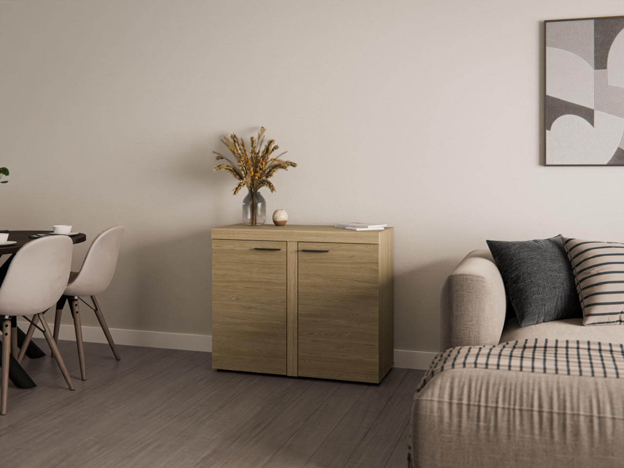 Zorganizuj swój salon w najlepszy możliwy sposób z designem i stylem Mebelzone. Komoda Rumba wykonana z płyty laminowanej 15mm w kolorze dąb olejowany z 2 uchylnymi frontami to mebel, którego nie może zabraknąć w żadnym salonie.