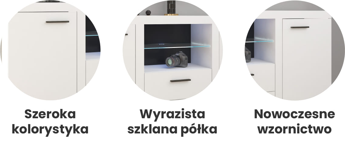 Zorganizuj swój salon w najlepszy możliwy sposób z designem i stylem Mebelzone. Komoda Rumba wykonana z płyty laminowanej 15mm w kolorze biały mat z 2 szufladami, 2 uchylnymi frontami i eleganckimi szklanymi półkami, które opcjonalnie można podświetlić oświetleniem LED to mebel, którego nie może zabraknąć w żadnym salonie.