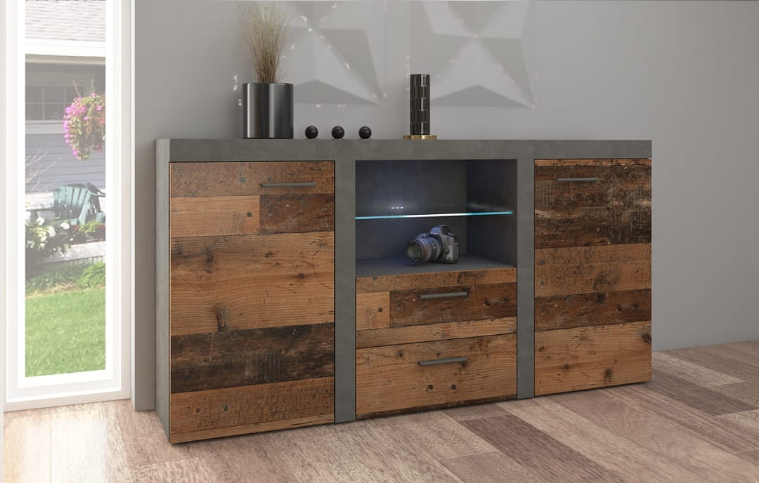 Zorganizuj swój salon w najlepszy możliwy sposób z designem i stylem Mebelzone. Komoda Rumba wykonana z płyty laminowanej 15mm w kolorze old style z 2 szufladami, 2 uchylnymi frontami i eleganckimi szklanymi półkami, które opcjonalnie można podświetlić oświetleniem LED to mebel, którego nie może zabraknąć w żadnym salonie.