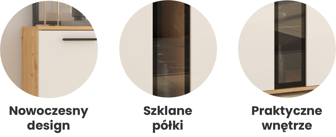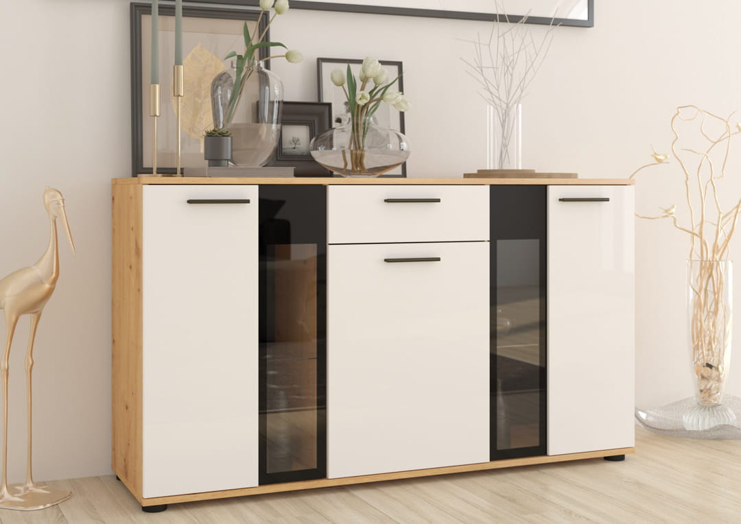 Komoda Salsa dostępna jest w kilku modnych kolorach: biały, dąb sonoma, dąb lefkas, dąb artisan + biały, old style + matera. Wyraźne linie, eleganckie fronty i matowe białe elementy składają się na harmonijny obraz całości. Komodę Salsa można łączyć z wieloma koncepcjami wyposażenia i znakomicie komponuje się z Meblościanką Salsa z tej samej kolekcji. Za trzema drzwiami mebel oferuje mnóstwo powierzchni do przechowywania książek lub akcesoriów domowych, a w poręcznej szufladzie znajdziesz jeszcze więcej miejsca. Komoda Salsa zapewnia porządek w salonie, sypialni lub jadalni i łączy praktyczność z elegancją. Pod względem jakości wykonania komoda Salsa imponuje łatwością pielęgnacji.