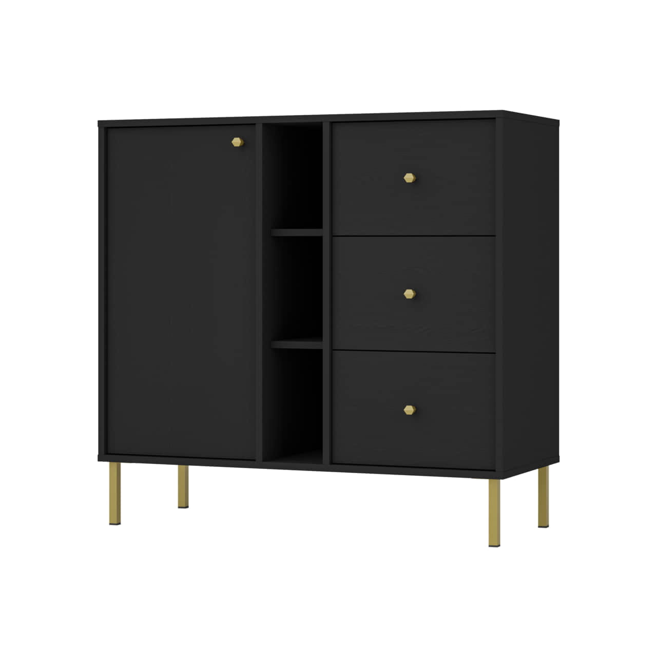 Komoda Tokio 1F3S wyposażona została w front rozchylny, trzy wysuwane szuflady oraz otwarte półki.