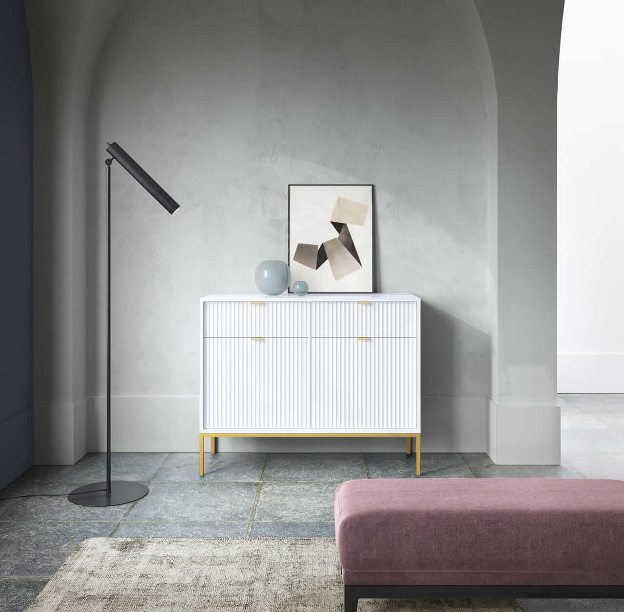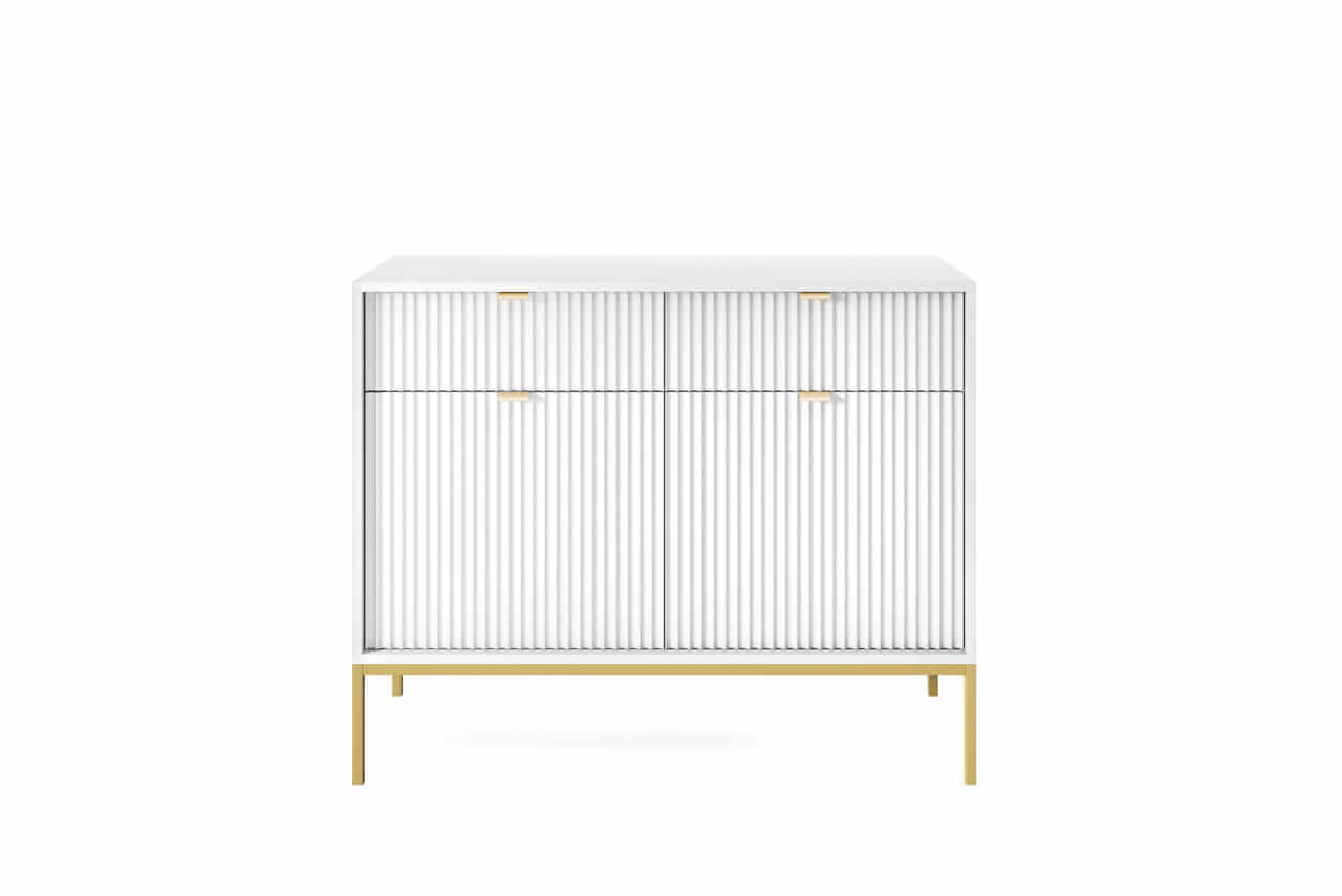 Kolekcja mebli Nova to nowoczesne połączenie funkcjonalności i minimalistycznego designu, idealne do stylowych wnętrz. Charakteryzuje się jasną kolorystyką z dominującą bielą, subtelnymi złotymi uchwytami oraz eleganckimi pionowymi żłobieniami na frontach. Smukłe, metalowe nóżki nadają meblom lekkości, a ich wysoka jakość wykonania zapewnia trwałość i wygodę użytkowania. Kolekcja obejmuje różnorodne elementy, takie jak komody, stoliki kawowe oraz szafki RTV, co pozwala na spójne urządzenie przestrzeni. Idealna dla osób ceniących prostotę, nowoczesność i harmonijne wnętrza.