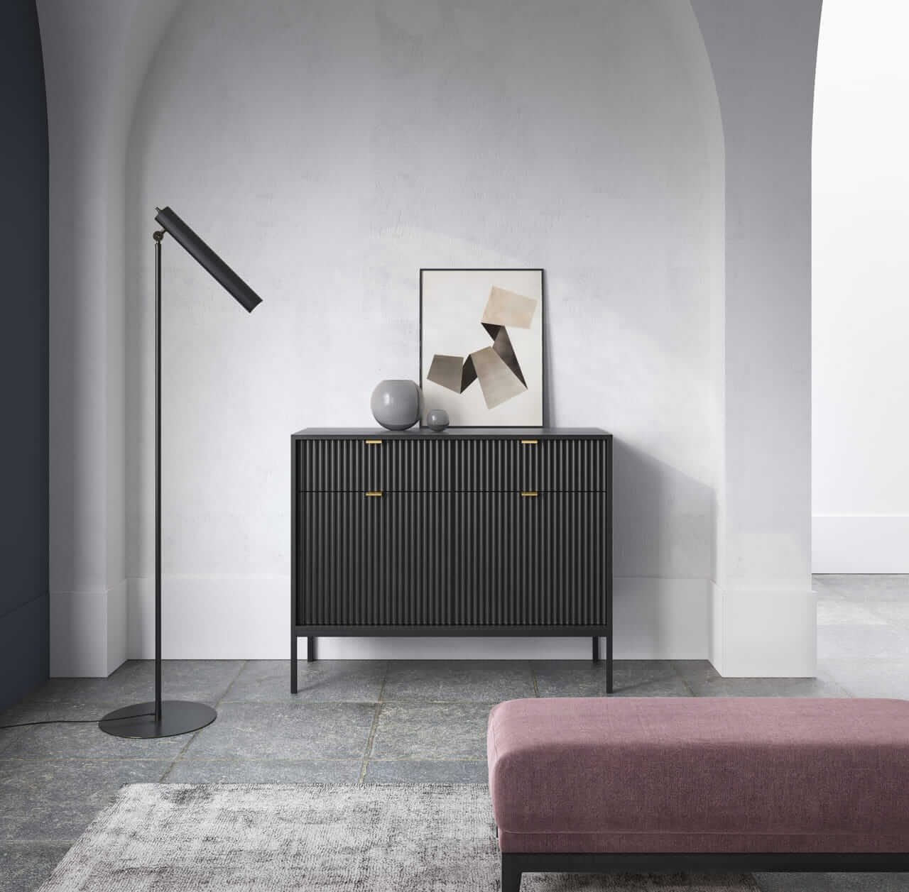 Kolekcja mebli Nova to nowoczesne połączenie funkcjonalności i minimalistycznego designu, idealne do stylowych wnętrz. Charakteryzuje się ciemną kolorystyką z dominującą czernią, subtelnymi złotymi uchwytami oraz eleganckimi pionowymi żłobieniami na frontach. Smukłe, metalowe nóżki nadają meblom lekkości, a ich wysoka jakość wykonania zapewnia trwałość i wygodę użytkowania. Kolekcja obejmuje różnorodne elementy, takie jak komody, stoliki kawowe oraz szafki RTV, co pozwala na spójne urządzenie przestrzeni. Idealna dla osób ceniących prostotę, nowoczesność i harmonijne wnętrza.