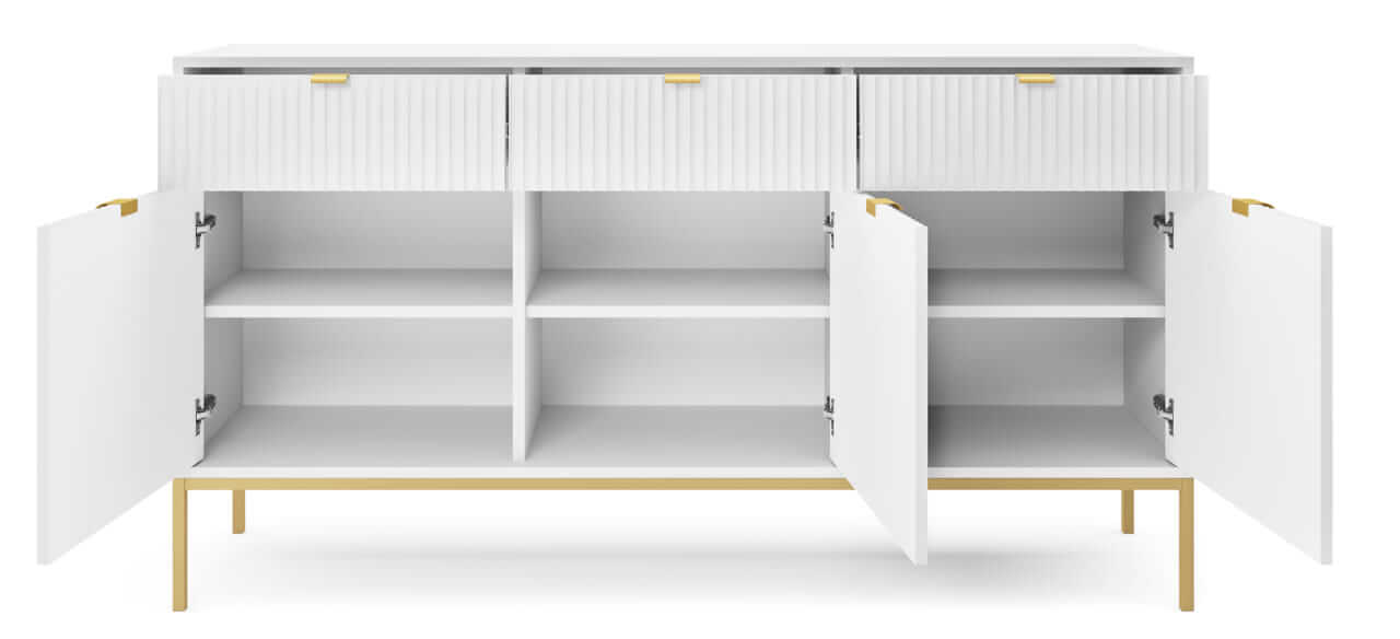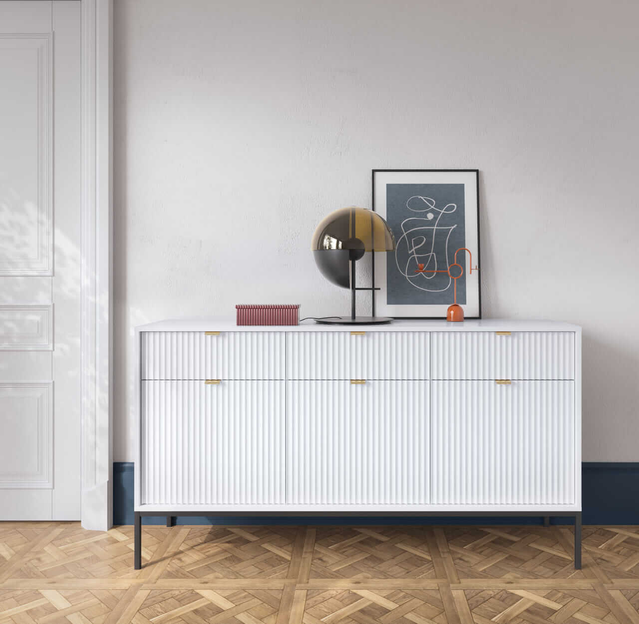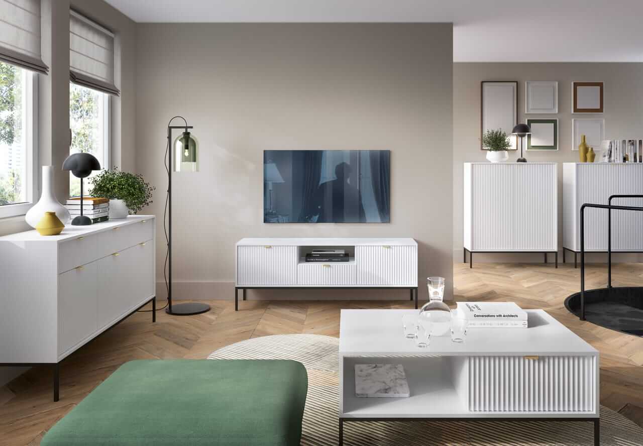 Kolekcja mebli Nova to nowoczesne połączenie funkcjonalności i minimalistycznego designu, idealne do stylowych wnętrz. Charakteryzuje się jasną kolorystyką z dominującą bielą, subtelnymi złotymi uchwytami oraz eleganckimi pionowymi żłobieniami na frontach. Smukłe, metalowe nóżki nadają meblom lekkości, a ich wysoka jakość wykonania zapewnia trwałość i wygodę użytkowania. Kolekcja obejmuje różnorodne elementy, takie jak komody, stoliki kawowe oraz szafki RTV, co pozwala na spójne urządzenie przestrzeni. Idealna dla osób ceniących prostotę, nowoczesność i harmonijne wnętrza.