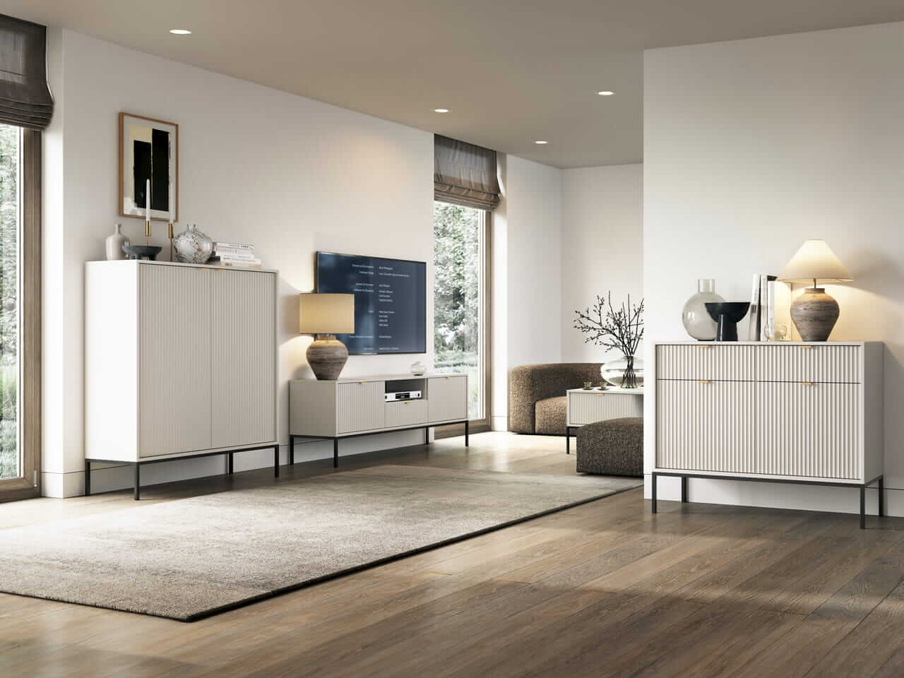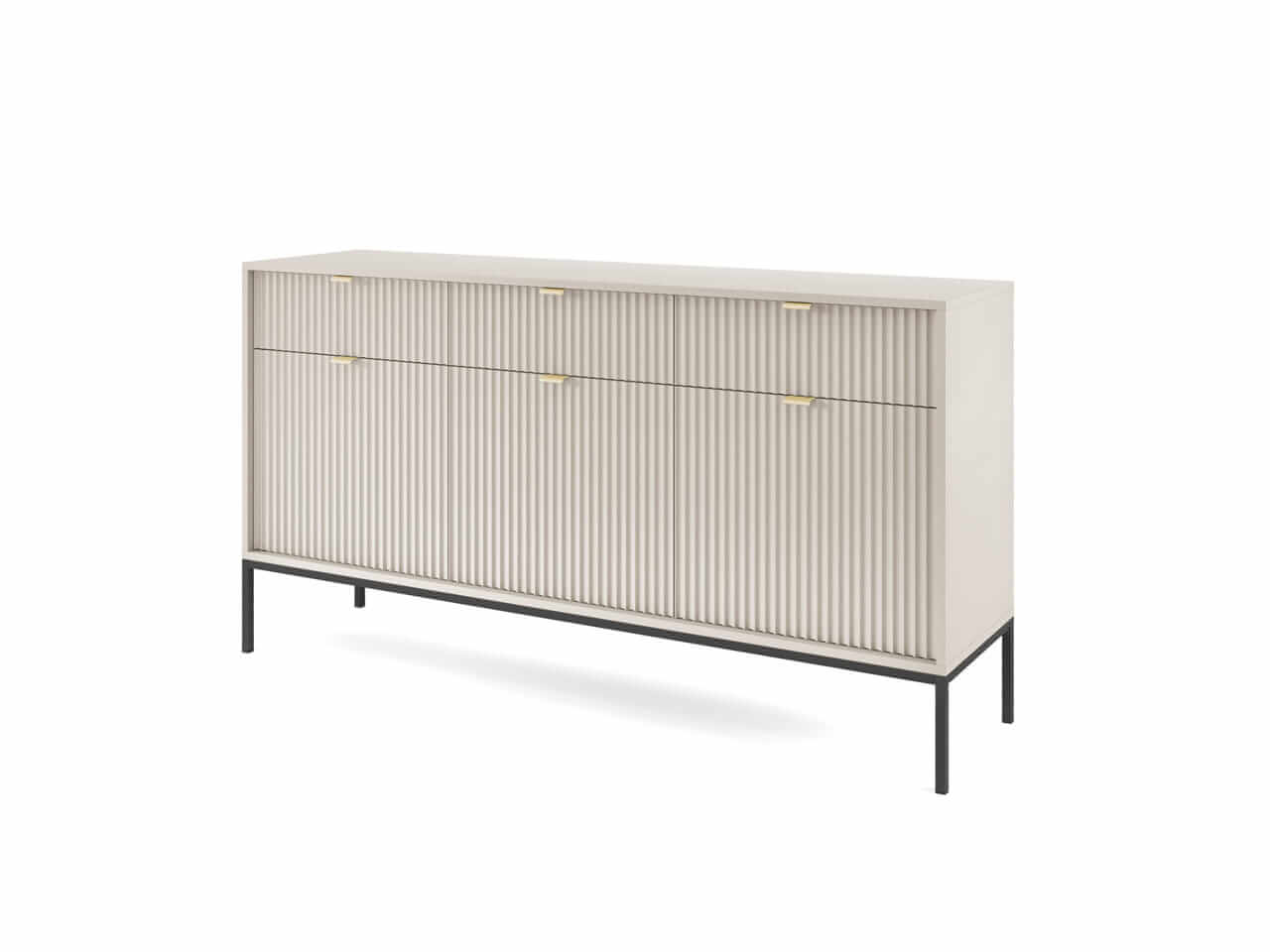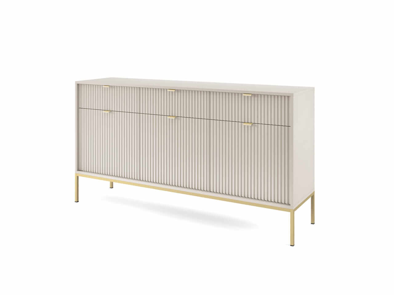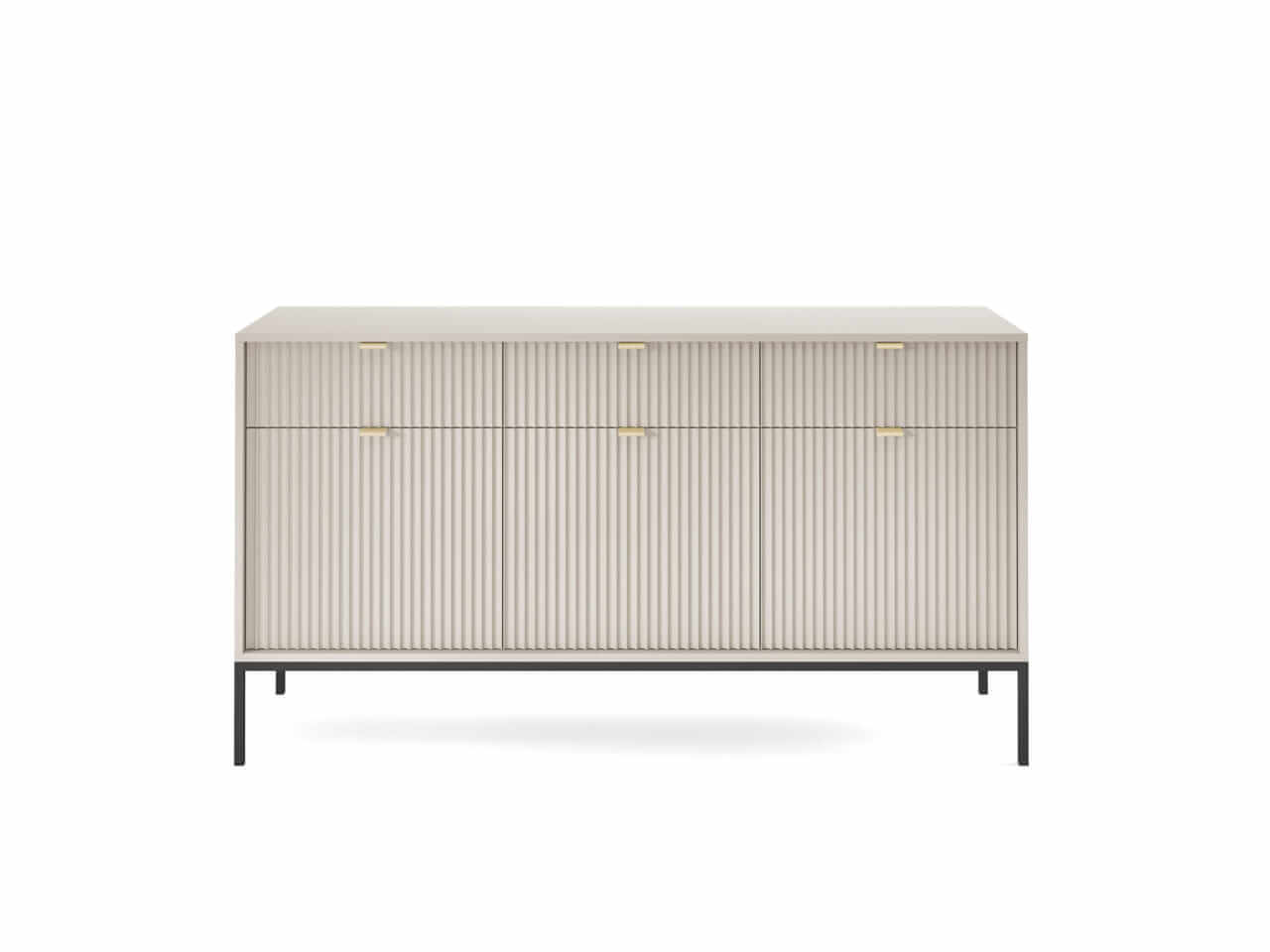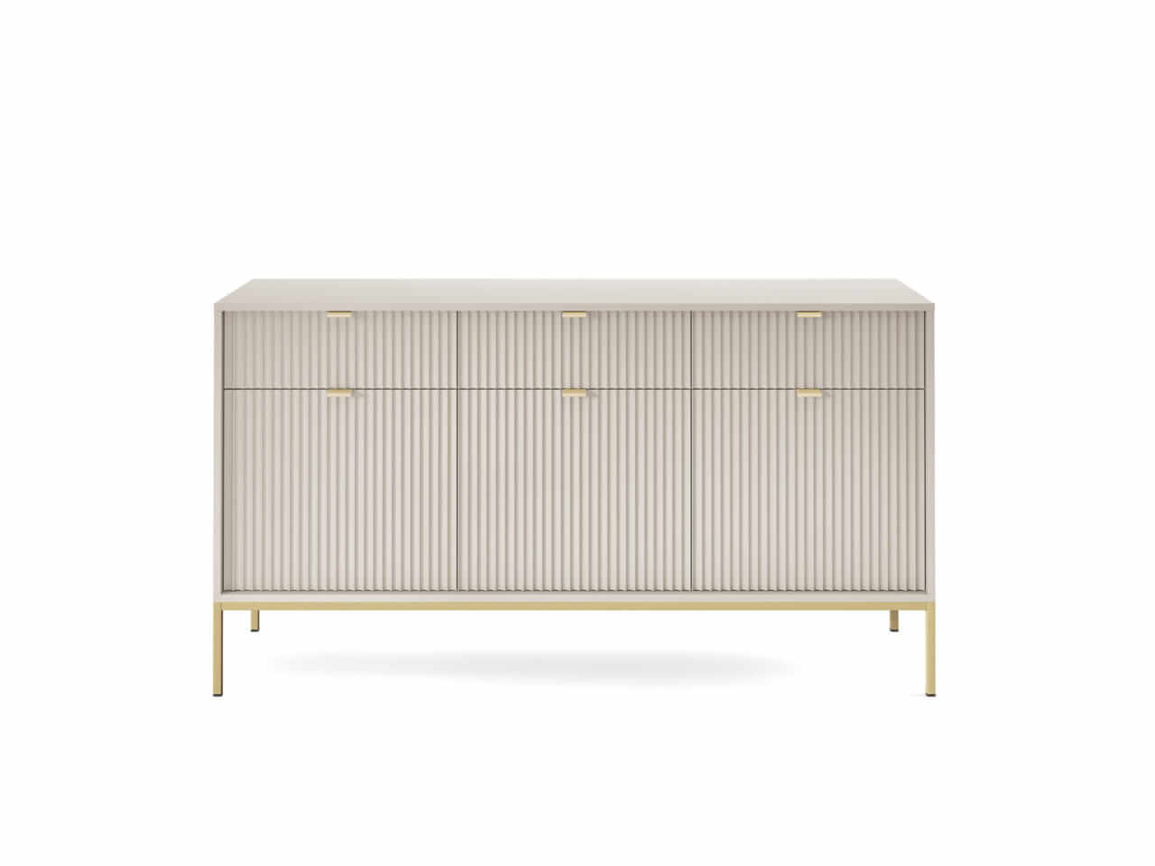 Kolekcja mebli Nova to nowoczesne połączenie funkcjonalności i minimalistycznego designu, idealne do stylowych wnętrz. Charakteryzuje się jasną kolorystyką z dominującym kaszmirem, subtelnymi złotymi uchwytami oraz eleganckimi pionowymi żłobieniami na frontach. Smukłe, metalowe nóżki nadają meblom lekkości, a ich wysoka jakość wykonania zapewnia trwałość i wygodę użytkowania. Kolekcja obejmuje różnorodne elementy, takie jak komody, stoliki kawowe oraz szafki RTV, co pozwala na spójne urządzenie przestrzeni. Idealna dla osób ceniących prostotę, nowoczesność i harmonijne wnętrza.