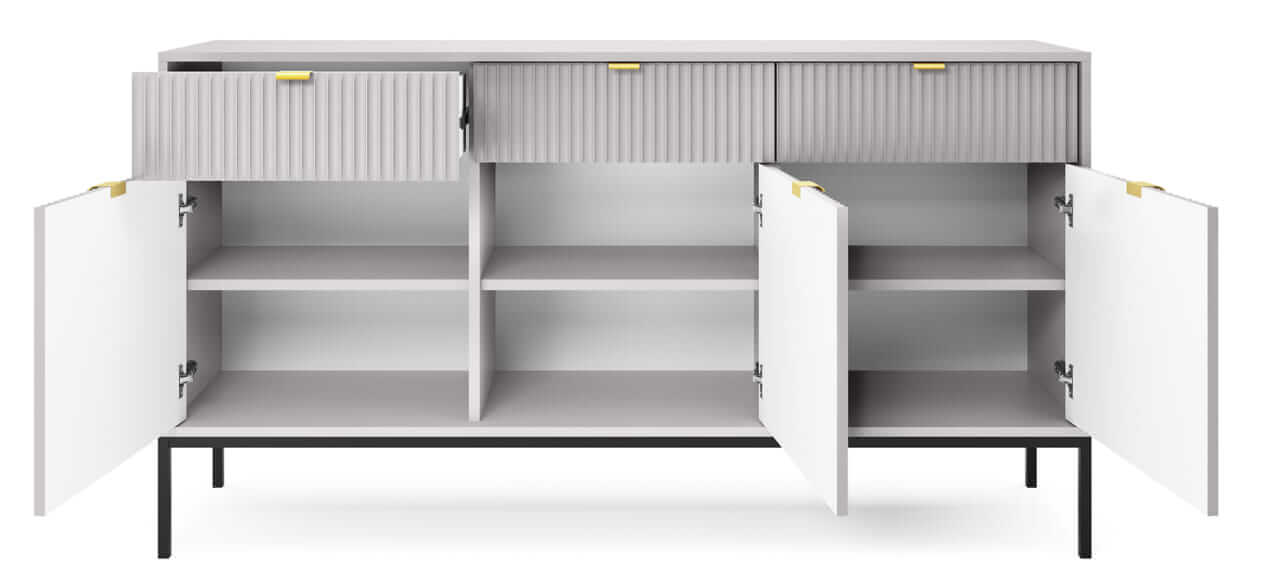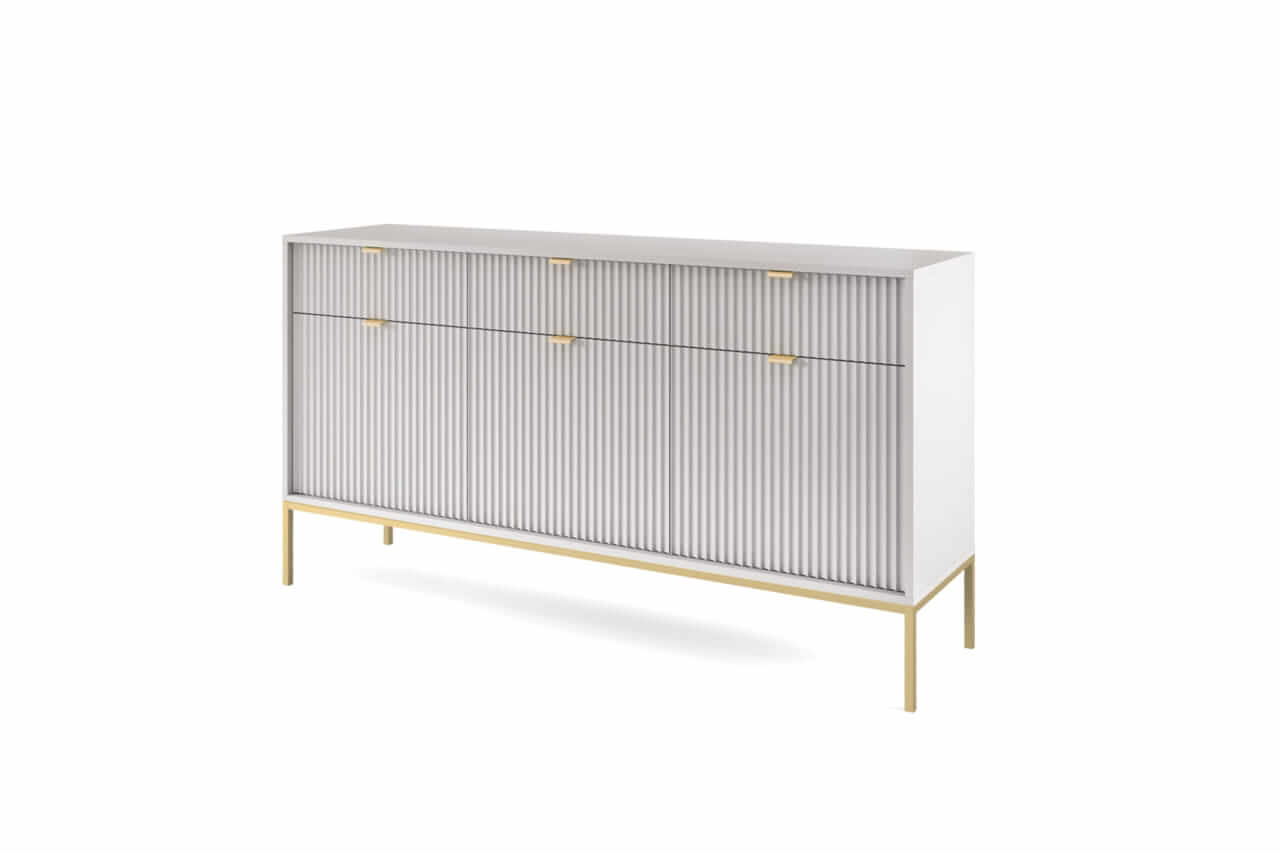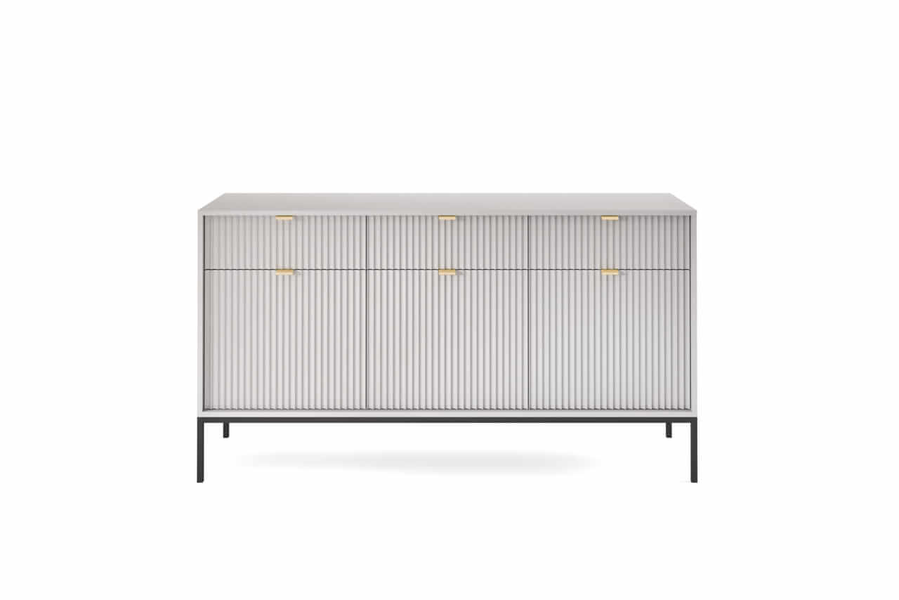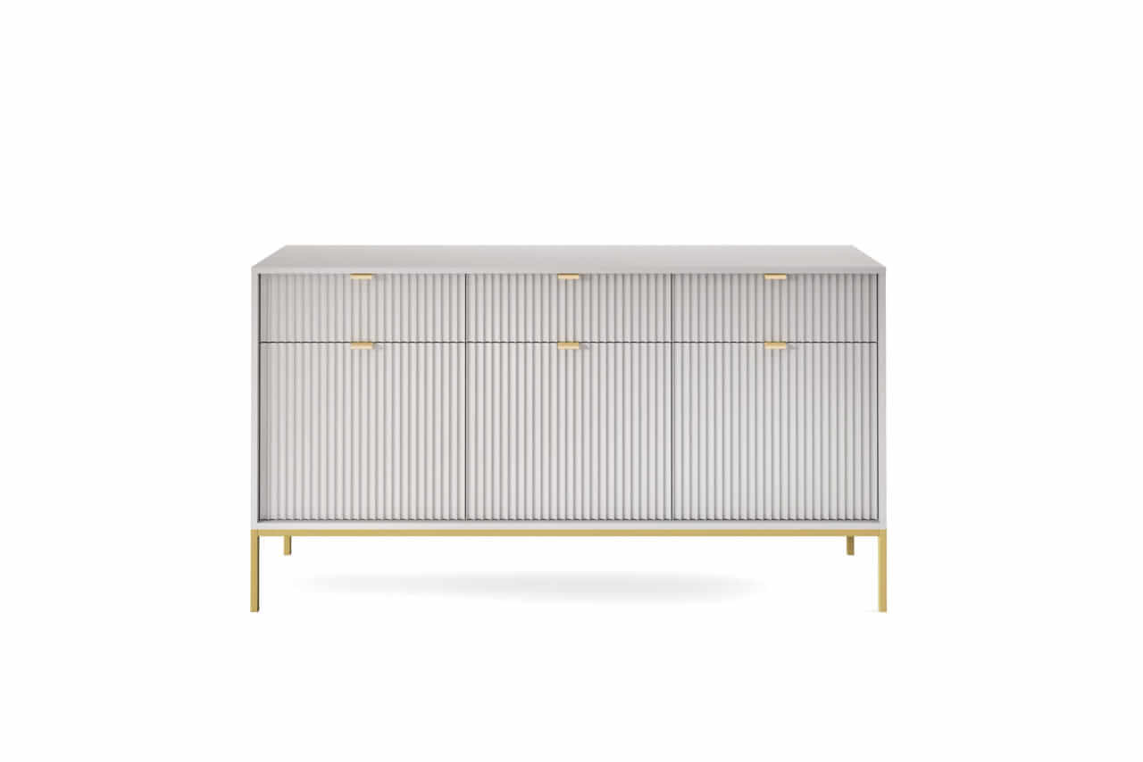 Kolekcja mebli Nova to nowoczesne połączenie funkcjonalności i minimalistycznego designu, idealne do stylowych wnętrz. Charakteryzuje się jasną szarą kolorystyką, subtelnymi złotymi uchwytami oraz eleganckimi pionowymi żłobieniami na frontach. Smukłe, metalowe nóżki nadają meblom lekkości, a ich wysoka jakość wykonania zapewnia trwałość i wygodę użytkowania. Kolekcja obejmuje różnorodne elementy, takie jak komody, stoliki kawowe oraz szafki RTV, co pozwala na spójne urządzenie przestrzeni. Idealna dla osób ceniących prostotę, nowoczesność i harmonijne wnętrza.