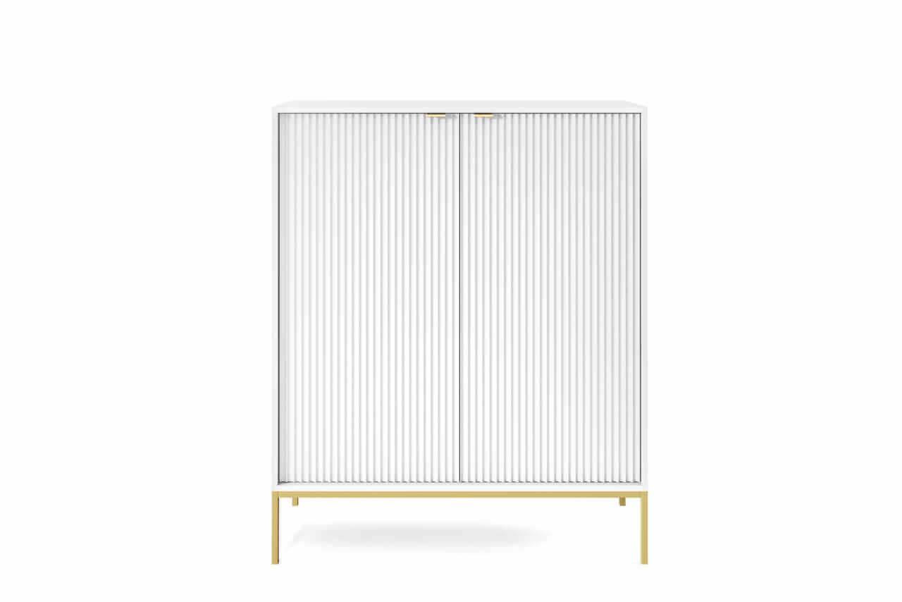 Kolekcja mebli Nova to nowoczesne połączenie funkcjonalności i minimalistycznego designu, idealne do stylowych wnętrz. Charakteryzuje się jasną kolorystyką z dominującą bielą, subtelnymi złotymi uchwytami oraz eleganckimi pionowymi żłobieniami na frontach. Smukłe, metalowe nóżki nadają meblom lekkości, a ich wysoka jakość wykonania zapewnia trwałość i wygodę użytkowania. Kolekcja obejmuje różnorodne elementy, takie jak komody, stoliki kawowe oraz szafki RTV, co pozwala na spójne urządzenie przestrzeni. Idealna dla osób ceniących prostotę, nowoczesność i harmonijne wnętrza.