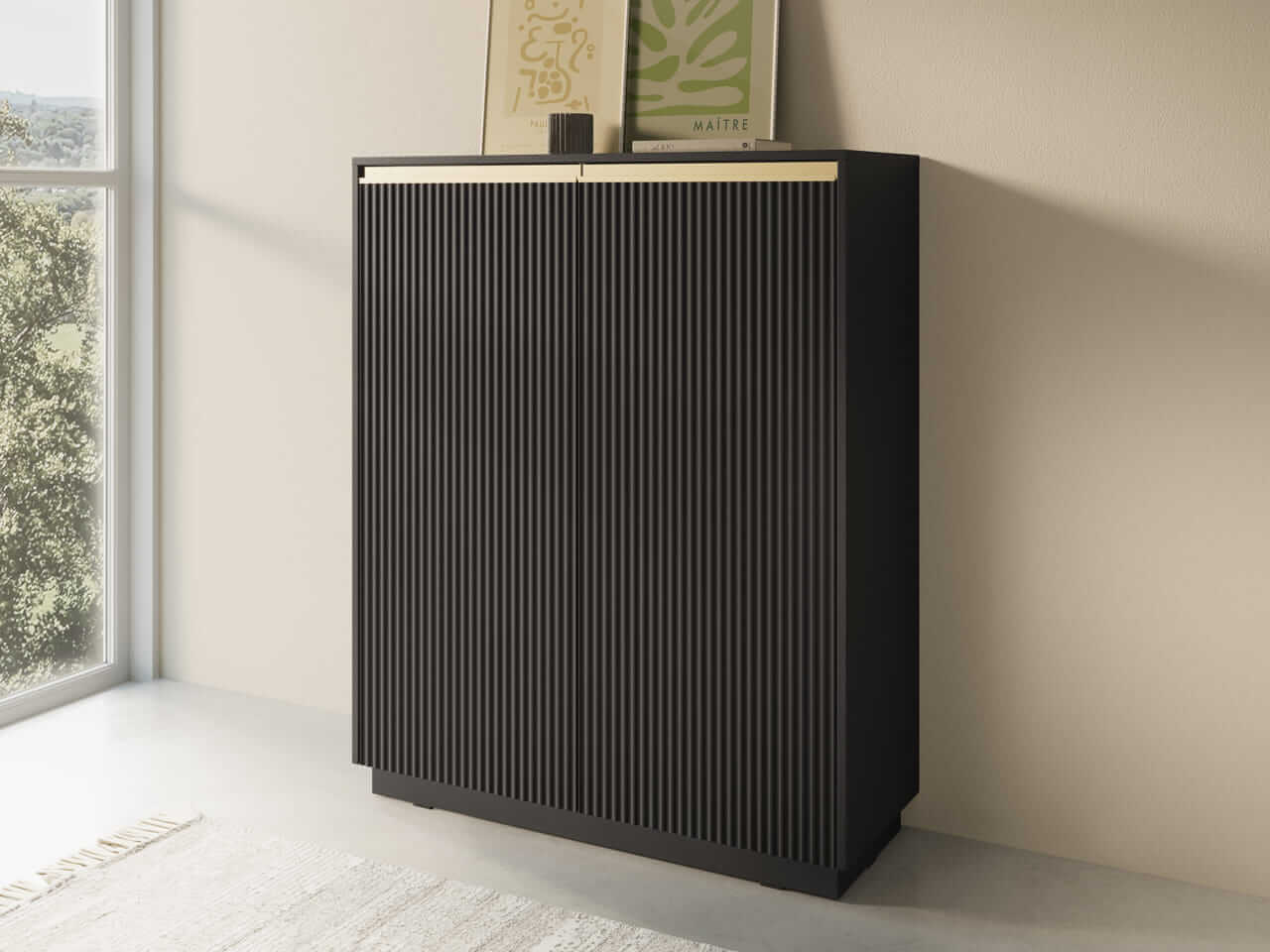 Kolekcja mebli Royal to wyjątkowe połączenie nowoczesnego designu i funkcjonalności, które doskonale wpisuje się w potrzeby współczesnych wnętrz. Ciemna kolorystyka mebli z czarnym wykończeniem oraz subtelne, pionowe żłobienia dodają elegancji i lekkości całej aranżacji. Złote akcenty podkreślają prestiżowy charakter kolekcji, a minimalistyczny wygląd sprawia, że meble świetnie komponują się zarówno w nowoczesnych, jak i klasycznych przestrzeniach.