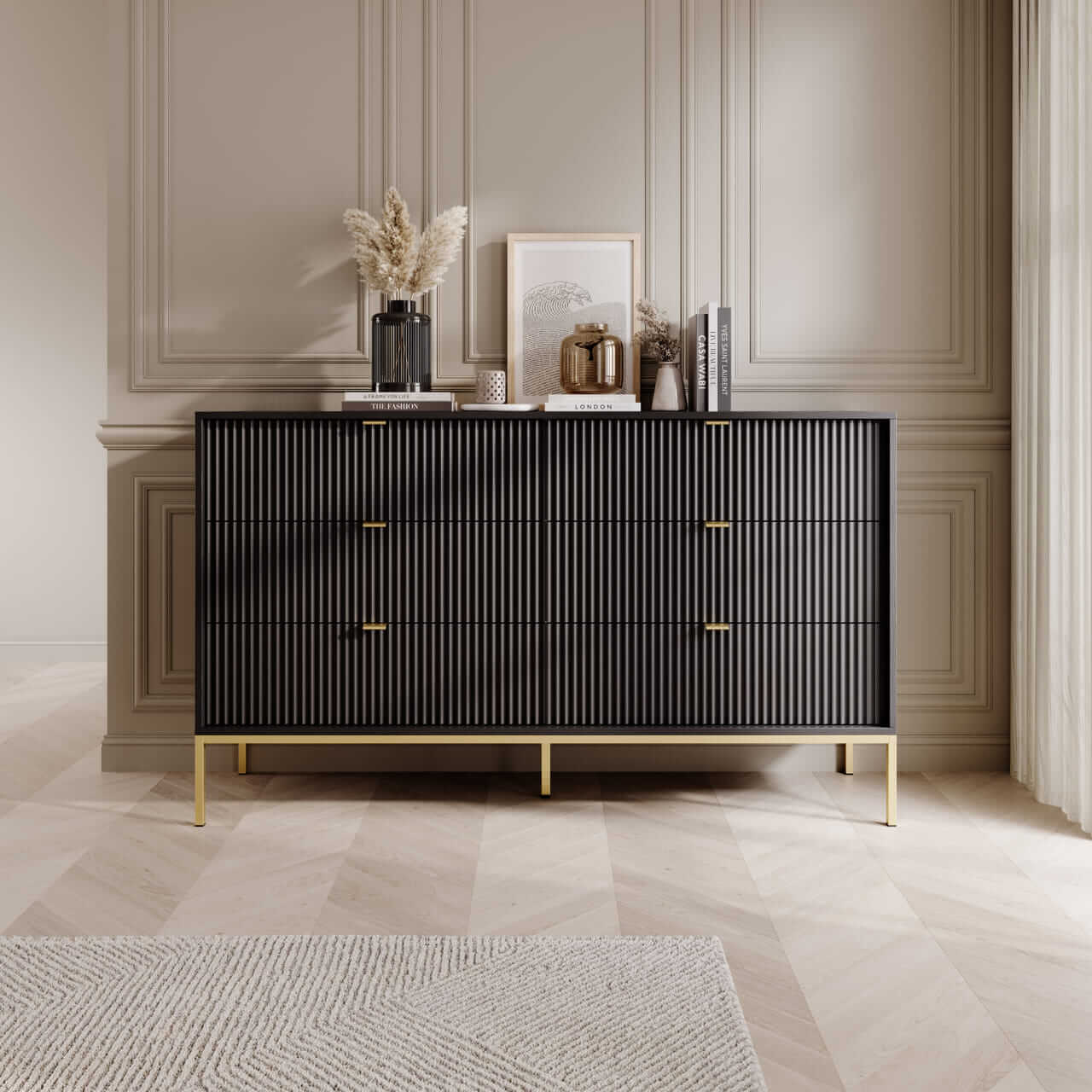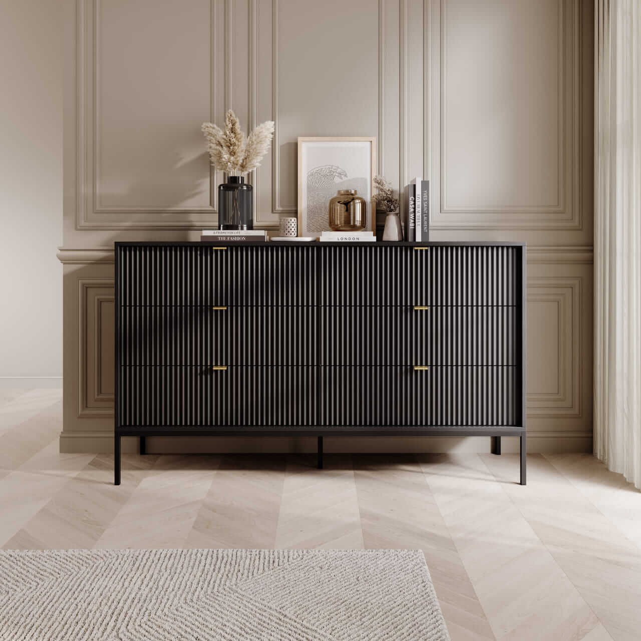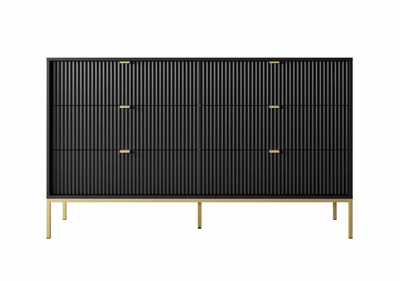 Kolekcja mebli Nova to nowoczesne połączenie funkcjonalności i minimalistycznego designu, idealne do stylowych wnętrz. Charakteryzuje się ciemną kolorystyką z dominującą czerni, subtelnymi złotymi uchwytami oraz eleganckimi pionowymi żłobieniami na frontach. Smukłe, metalowe nóżki nadają meblom lekkości, a ich wysoka jakość wykonania zapewnia trwałość i wygodę użytkowania. Kolekcja obejmuje różnorodne elementy, takie jak komody, stoliki kawowe oraz szafki RTV, co pozwala na spójne urządzenie przestrzeni. Idealna dla osób ceniących prostotę, nowoczesność i harmonijne wnętrza.