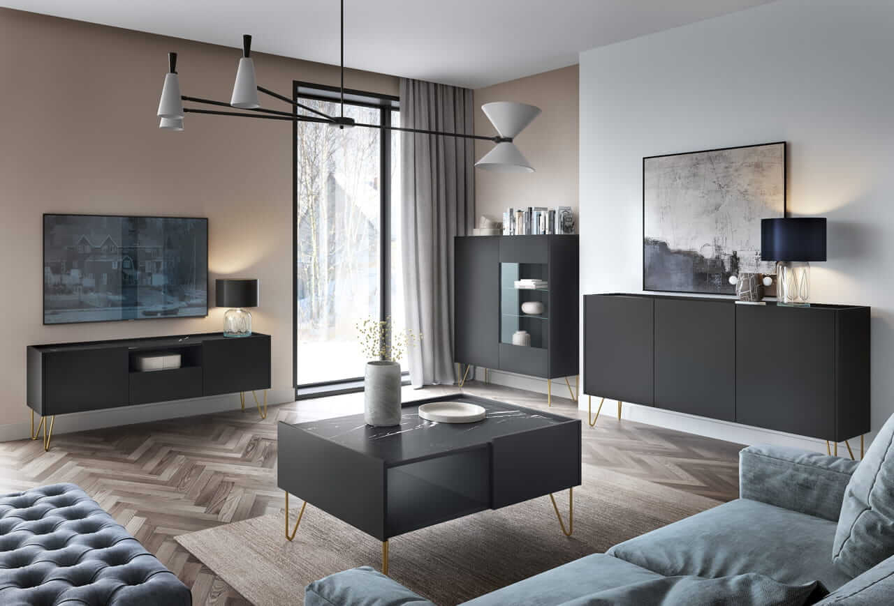 Połysk i mat mienią się w czerniach frontów, korpusów i marmurowego dekoru blatu. Złota noga czerpiąca ze stylu lat sześćdziesiątych podkreśla elegancję. Fronty i korpus, wystające ponad górny blat, tworzą wokół niego rant, charakterystyczny dla tacy.