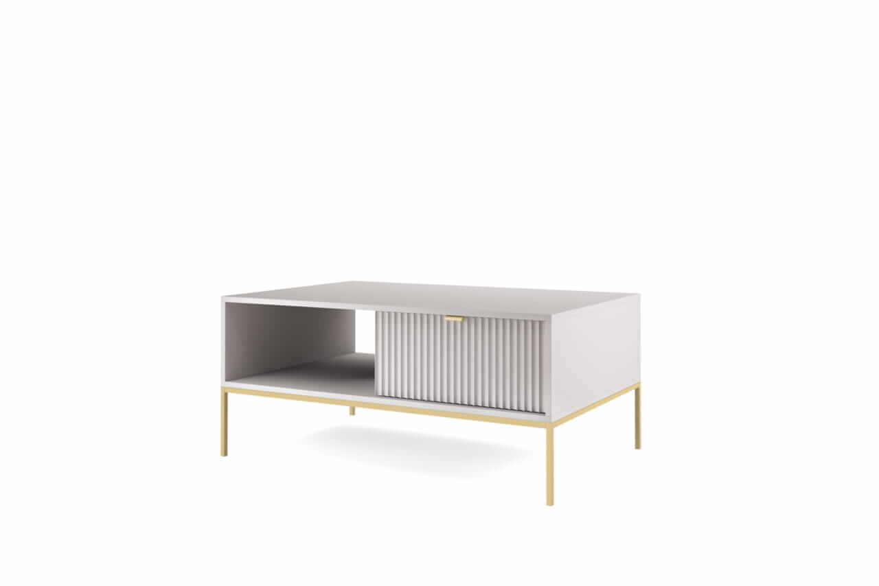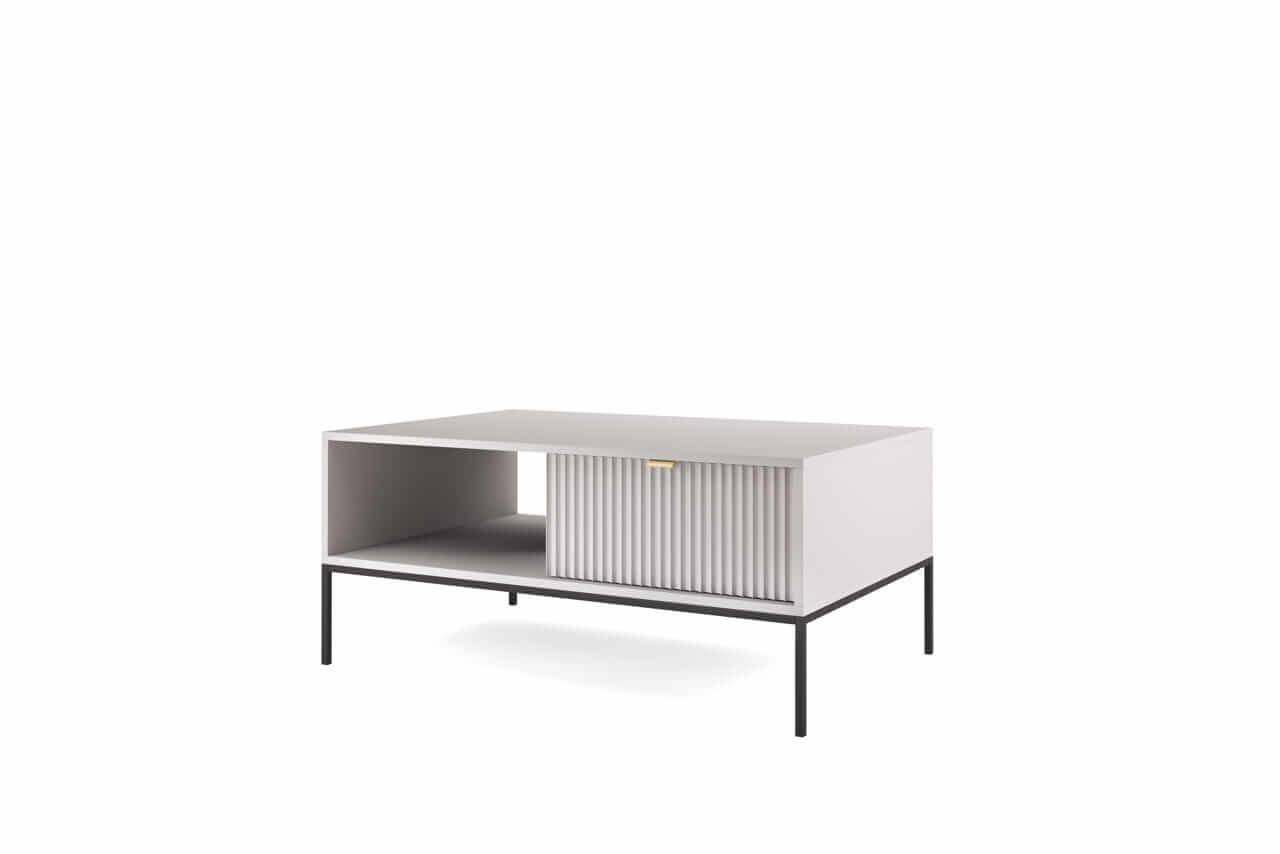 Kolekcja mebli Nova to nowoczesne połączenie funkcjonalności i minimalistycznego designu, idealne do stylowych wnętrz. Charakteryzuje się jasną szarą kolorystyką, subtelnymi złotymi uchwytami oraz eleganckimi pionowymi żłobieniami na frontach. Smukłe, metalowe nóżki nadają meblom lekkości, a ich wysoka jakość wykonania zapewnia trwałość i wygodę użytkowania. Kolekcja obejmuje różnorodne elementy, takie jak komody, stoliki kawowe oraz szafki RTV, co pozwala na spójne urządzenie przestrzeni. Idealna dla osób ceniących prostotę, nowoczesność i harmonijne wnętrza.
