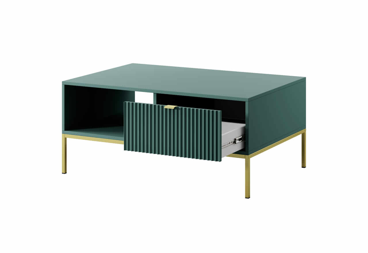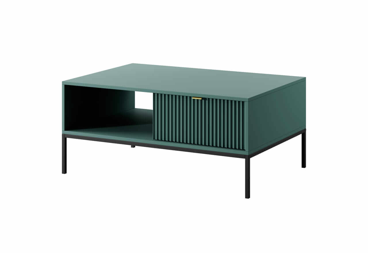 Kolekcja mebli Nova to nowoczesne połączenie funkcjonalności i minimalistycznego designu, idealne do stylowych wnętrz. Charakteryzuje się ciemniejszą kolorystyką z dominującą zielenią, subtelnymi złotymi uchwytami oraz eleganckimi pionowymi żłobieniami na frontach. Smukłe, metalowe nóżki nadają meblom lekkości, a ich wysoka jakość wykonania zapewnia trwałość i wygodę użytkowania. Kolekcja obejmuje różnorodne elementy, takie jak komody, stoliki kawowe oraz szafki RTV, co pozwala na spójne urządzenie przestrzeni. Idealna dla osób ceniących prostotę, nowoczesność i harmonijne wnętrza.