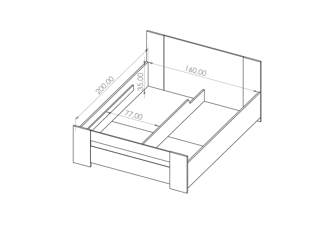 Korpus wykonano z płyty wiórowej o zróżnicowanej grubości – fronty 22, 16 i 12 mm, boki 22 mm, wezgłowie 22 i 16 mm – co przekłada się na stabilne podparcie materaca. Obrzeża zabezpieczono okleiną ABS, ograniczając podatność na uszkodzenia eksploatacyjne. W standardzie znajduje się drewniany stelaż unoszony za pomocą automatów sprężynowych oraz pojemnik na pościel z dnem wyposażonym w cztery wywietrzniki wspierające cyrkulację powietrza. Przy wymiarach 165 cm szerokości, 205 cm głębokości i 55 cm wysokości model stanowi dopracowane łóżko do sypialni 160x200 białe, przygotowane pod materac sprzedawany oddzielnie. Łóżko dostępne w 4 topowych wybarwieniach: biały, dąb artisan, dąb złoty, dąb monastery.