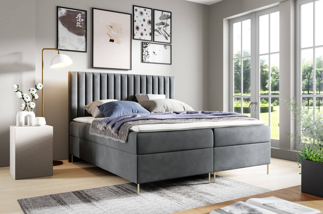 Zagłowie: wykonane jest na wzór równomiernie rozmieszczonych, pionowych paneli tapicerowanych, które nadają łóżku nowoczesny, elegancki wygląd. Panele są miękkie i przyjemne w dotyku, a ich geometryczny układ optycznie wydłuża zagłowie, dodając wnętrzu wyrafinowania.