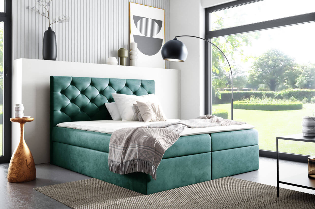 Łóżko kontynentalne z pojemnikiem Lara 200x200cm zieleń - tkanina Riviera 38