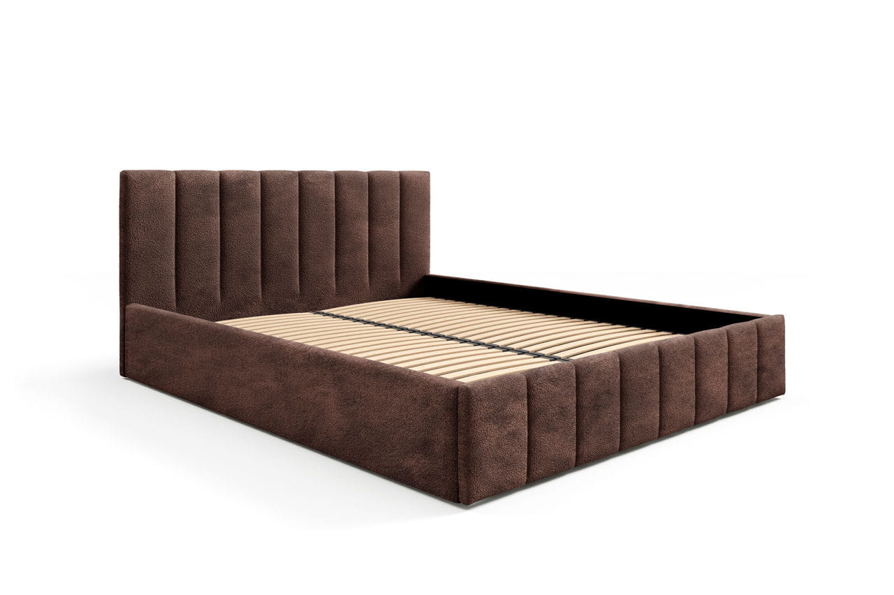 Stylowe i eleganckie łóżko tapicerowane Lena z zagłówkiem z pionowymi przeszyciami, które nadają mu nowoczesny charakter i zapewniają wygodne oparcie. Cała konstrukcja jest solidnie wykonana i obita wysokiej jakości, miękką tkaniną typu boucle, który dodaje wnętrzu luksusu.