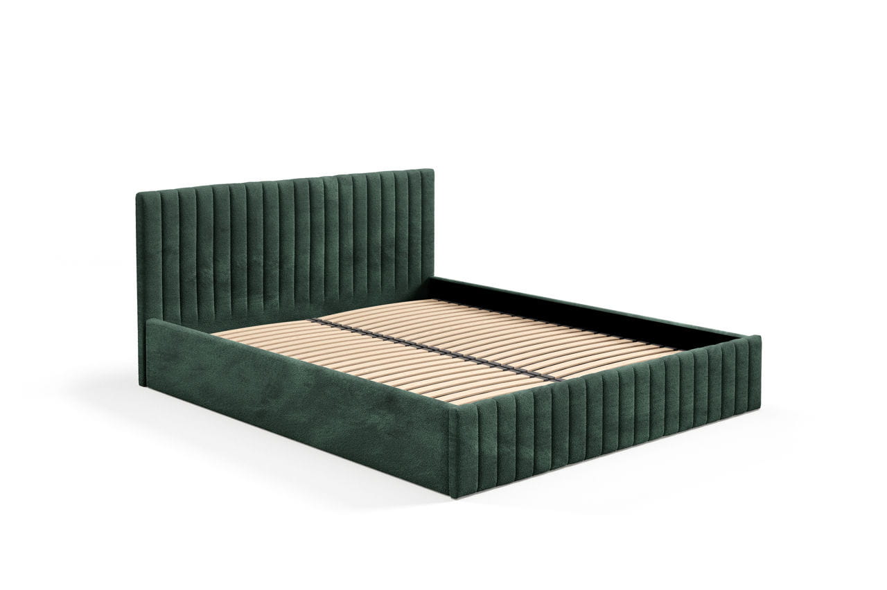 Stylowe i eleganckie łóżko tapicerowane Solaris z zagłówkiem w gęste pionowe przeszycia, które nadają mu nowoczesny charakter i zapewniają wygodne oparcie. Cała konstrukcja jest solidnie wykonana i obita wysokiej jakości, miękką tkaniną typu boucle, który dodaje wnętrzu luksusu.