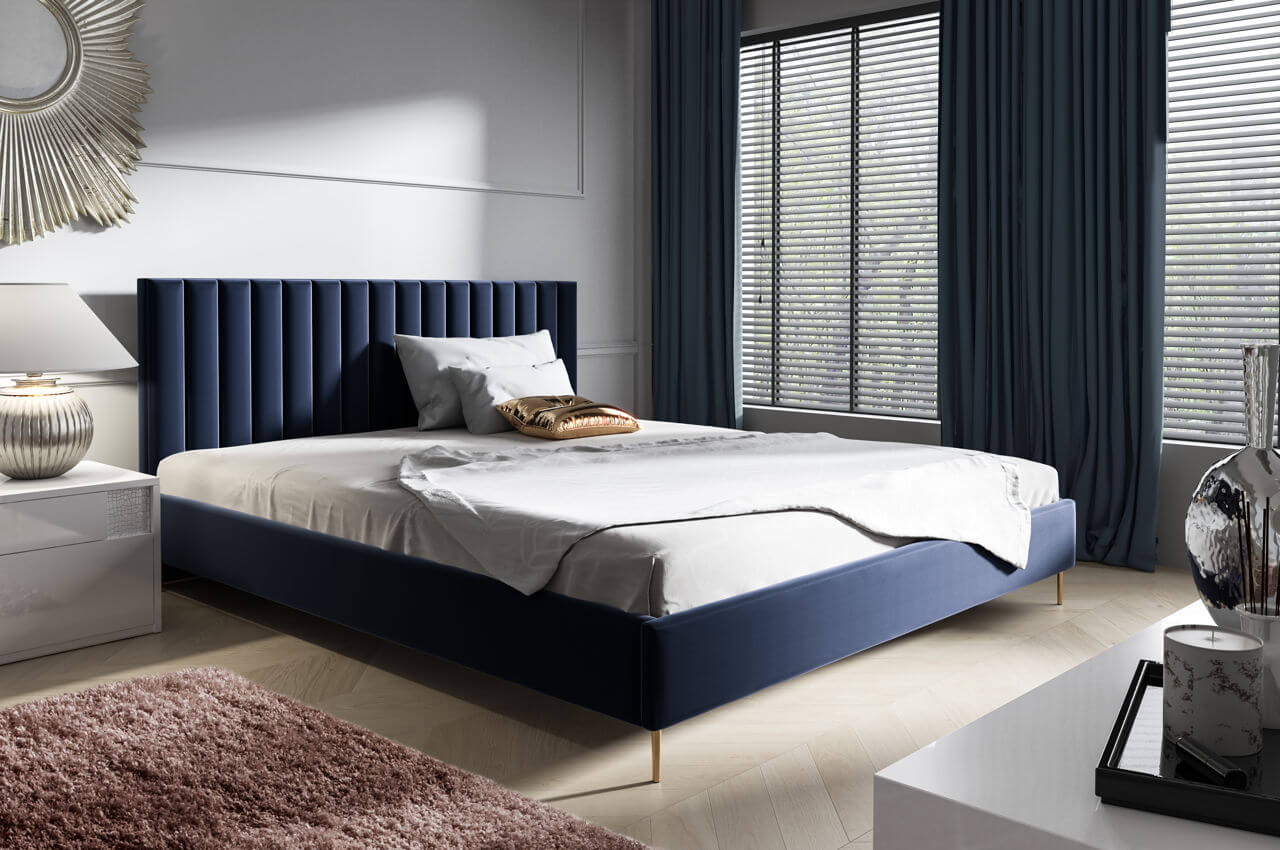 Stylowe i eleganckie łóżko tapicerowane Lira z zagłówkiem z pionowymi gęstymi przeszyciami, które nadają mu nowoczesny charakter i zapewniają wygodne oparcie. Cała konstrukcja jest solidnie wykonana i obita wysokiej jakości, miękką tkaniną typu velvet, która dodaje wnętrzu luksusu.