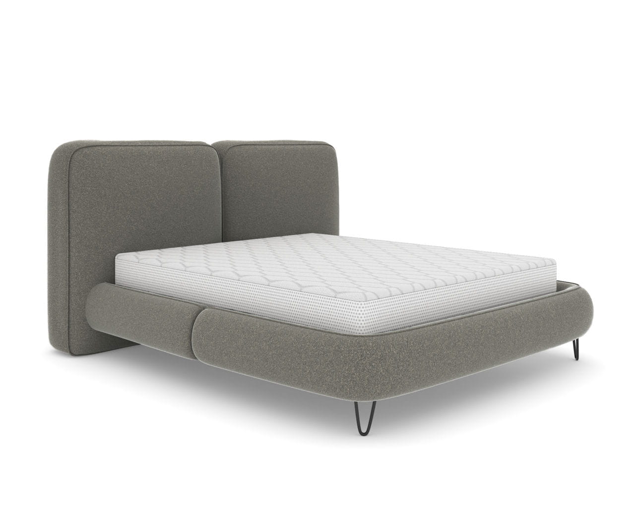 Łóżko wspiera się na smukłych, metalowych nóżkach, które dodają konstrukcji lekkości, a jednocześnie gwarantują stabilność. Solidna rama gwarantuje trwałość na lata, a staranne wykończenie z materiału o przyjemnej w dotyku strukturze sprawia, że mebel ten stanie się centralnym punktem każdej sypialni.