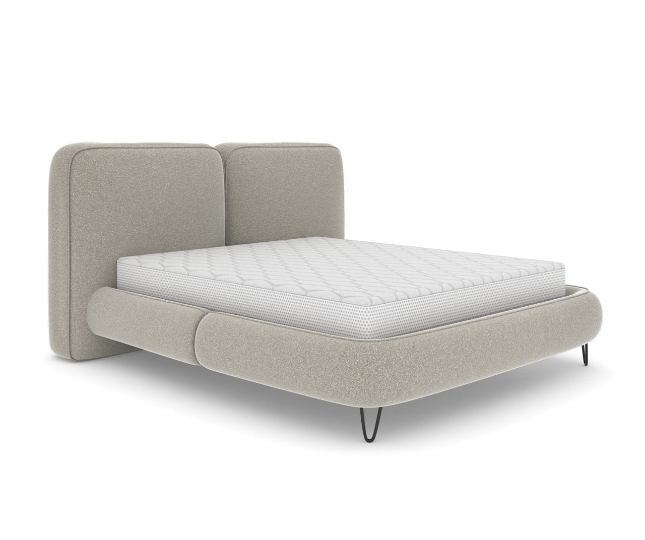 Łóżko wspiera się na smukłych, metalowych nóżkach, które dodają konstrukcji lekkości, a jednocześnie gwarantują stabilność. Solidna rama gwarantuje trwałość na lata, a staranne wykończenie z materiału o przyjemnej w dotyku strukturze sprawia, że mebel ten stanie się centralnym punktem każdej sypialni.