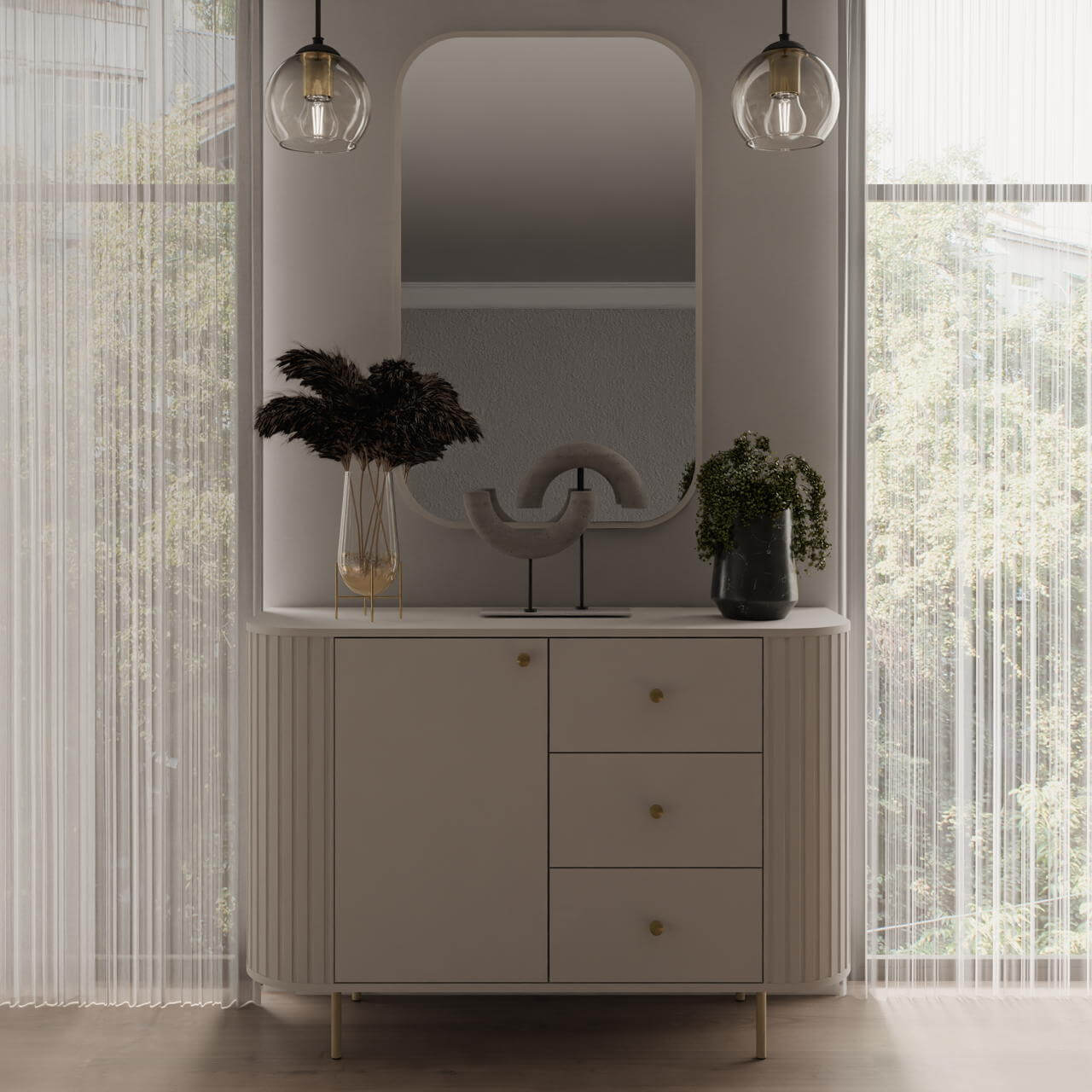 W skład kolekcji Ovalio wchodzą: komody, stoliki RTV, stolik kawowy, lustra, witryny oraz toaletka, co pozwala na kompleksowe i spójne urządzenie salonu, jadalni lub sypialni.