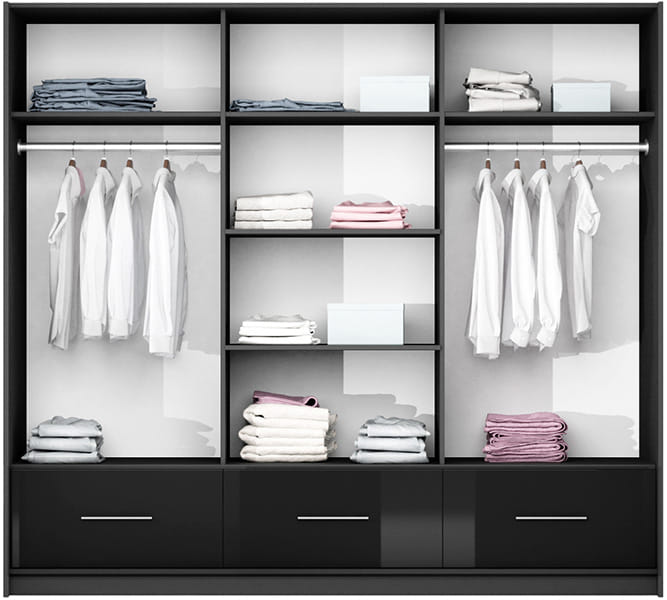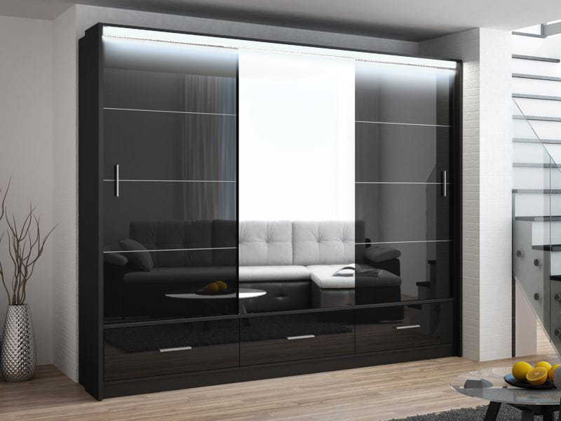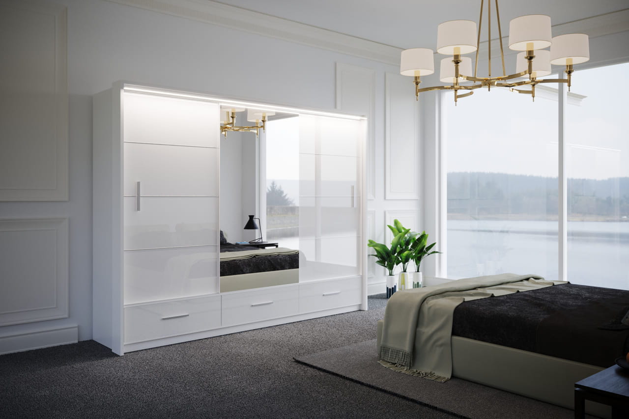 Szafy z serii Marsylia występują w dwóch najbardziej neutralnych, a przy tym uniwersalnych barwach – czerni i bieli. Dodając do tego wykończenie frontów w połysku oraz duże lustro otrzymujemy ponadczasowy, elegancki mebel do każdego wnętrza. Marsylia 203 jest szafą 2-skrzydłową, o ponadstandardowej wysokości.