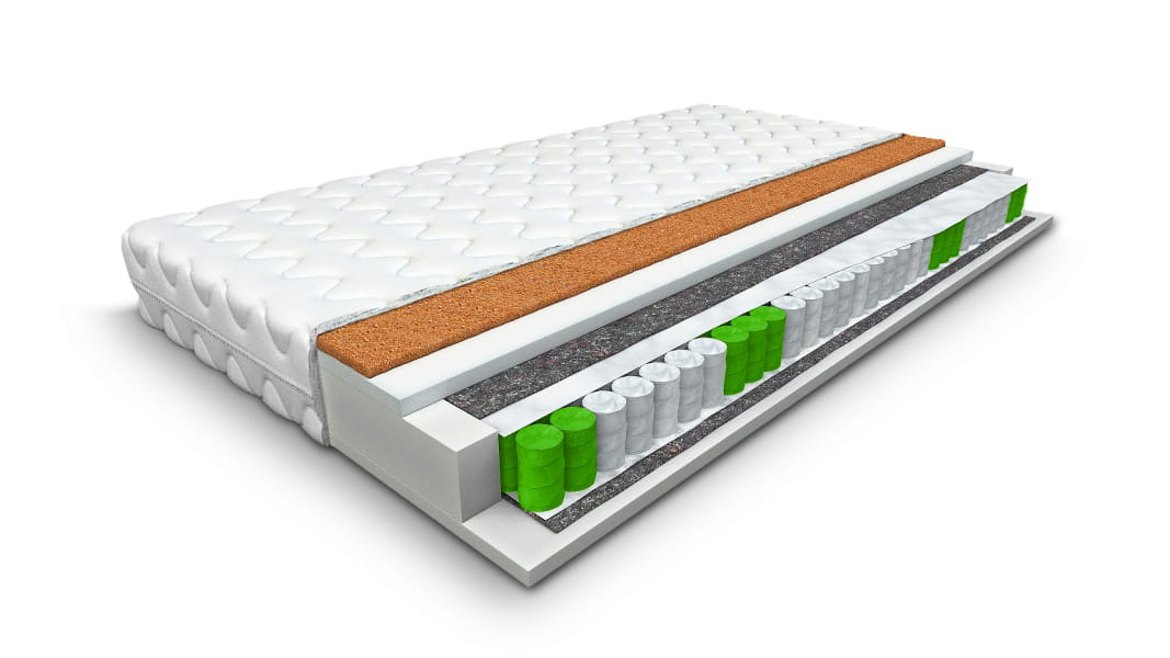 Materac kieszeniowy w rozmiarze 140x200cm obłożony obustronnie pianką t25 z dodatkiem maty kokosowej.