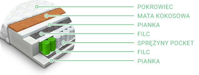 - 7-strefowe sprężyny kieszeniowe - 12cm – W materacach kieszeniowych stosuje się sprężyny z których każda jest umieszczona w osobnej tkaninie(kieszonce), dzielą one materac na 7 stref twardości, każda o odpowiednim podparciu dla danej części ciała. Materace typu pocket cechują się tym, że nie skrzypią, gdyż każda sprężyna pracuje niezależnie od siebie i przez to np. śpiąc z drugą osobą nie odczuwamy jej ruchów co gwarantuje spokojny sen.
