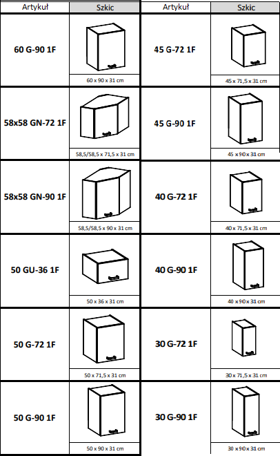 - szafki sprzedawane w paczkach wraz z czytelną instrukcją montażu oraz wszystkimi potrzebnymi okuciami,