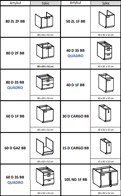 • 80 D 3S BB Quadro: 80 cm × 82 cm × 52 cm