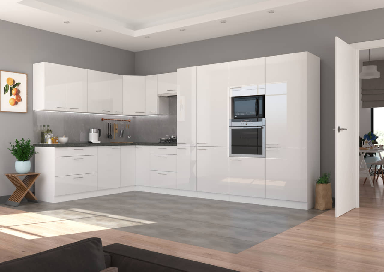 Zestaw mebli kuchennych Lara biały połysk o długości zabudowy 230 na 370cm w skład którego wchodzi 14 szafek bez blatu kuchennego.