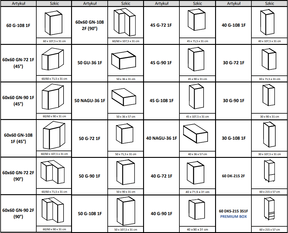 - szafki sprzedawane w paczkach wraz z czytelną instrukcją montażu oraz wszystkimi potrzebnymi okuciami,