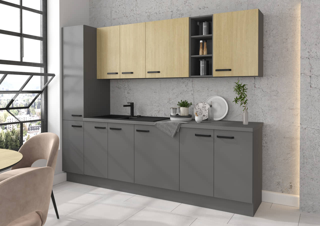 Zestaw kuchenny Scandi/Nessa o długości 260cm w skład którego wchodzi 8 szafek z dedykowanym blatem.
