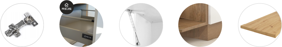 - zawiasy topowych producentów m.in. GTV, REJS z systemem cichego domykania w standardzie(nie dotyczy szafek narożnych)