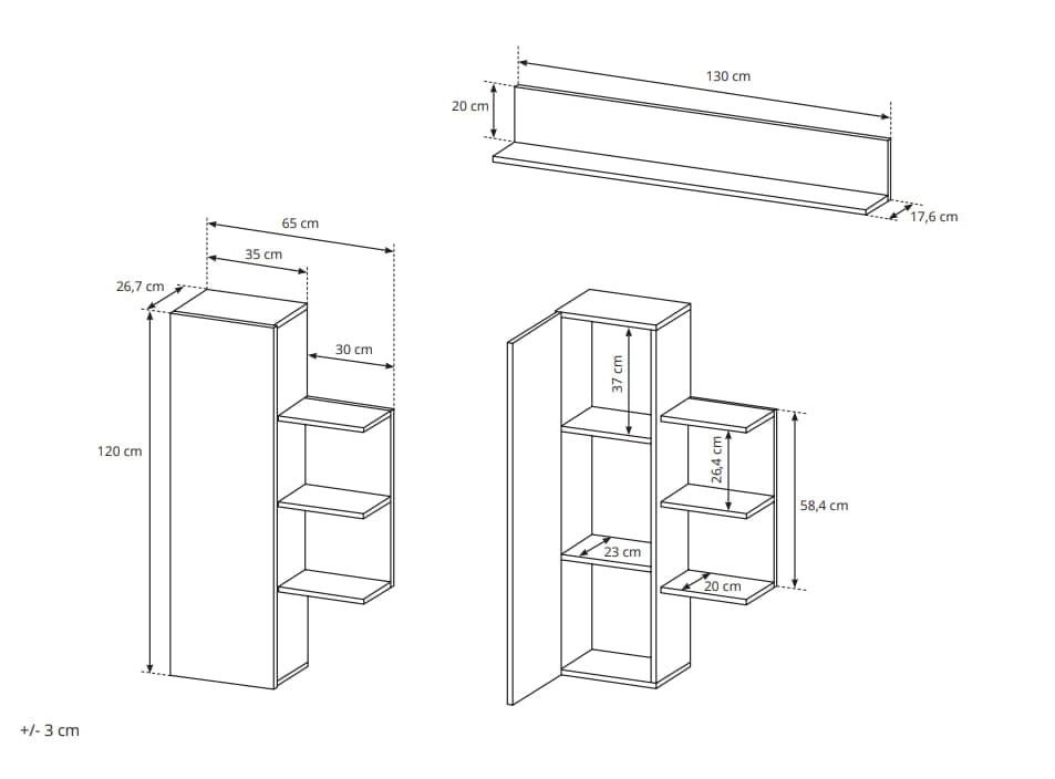 - półka wisząca - szer. 130 / wys. 20 / gł. 17,6 cm