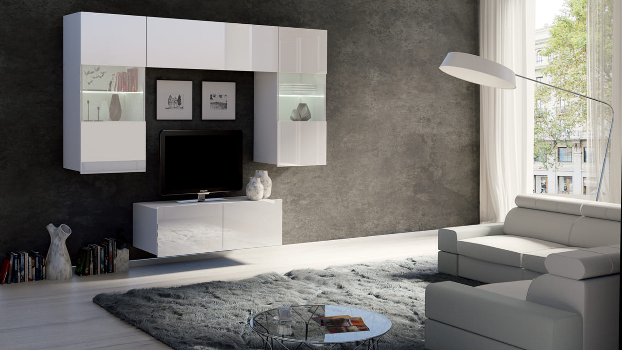 Meblościanka składa się z szafki RTV o szerokości 100cm, szafki wiszącej poziomej oraz dwóch witryn wiszących.