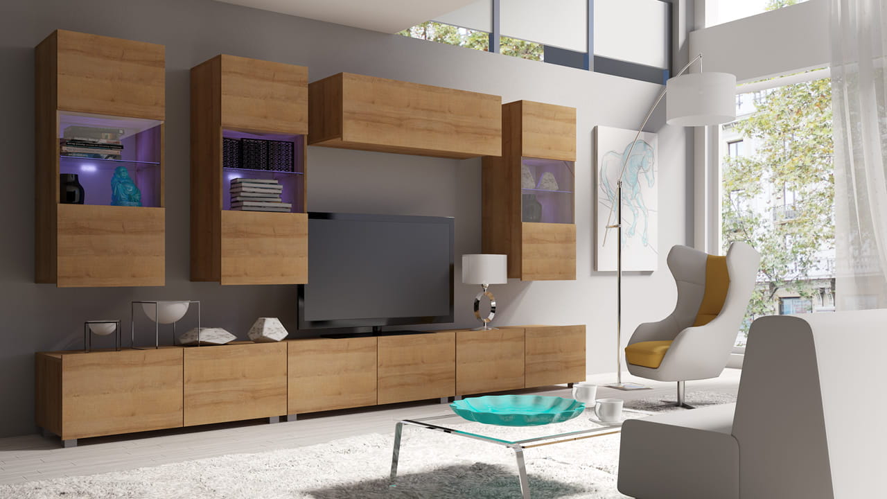 Meblościanka składa się z trzech szafek RTV o szerokości 100cm, szafki wiszącej poziomej oraz trzech witryn wiszących.