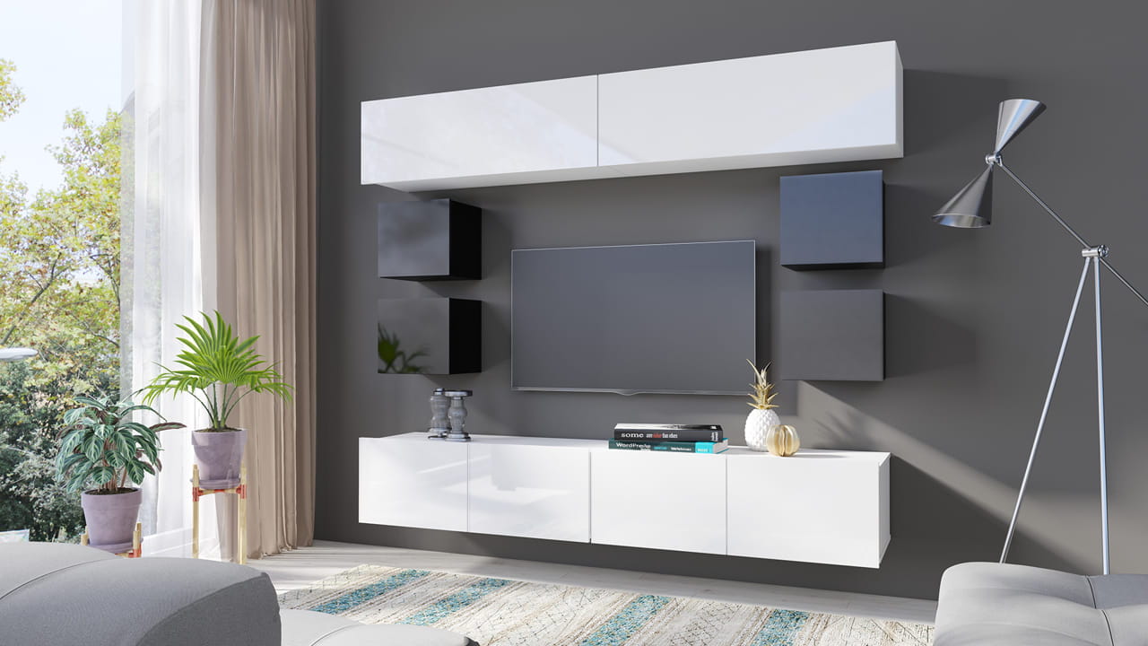 Meblościanka składa się z dwóch szafek RTV o szerokości 100cm, dwóch szafek wiszących poziomych oraz czterech kwadratów.