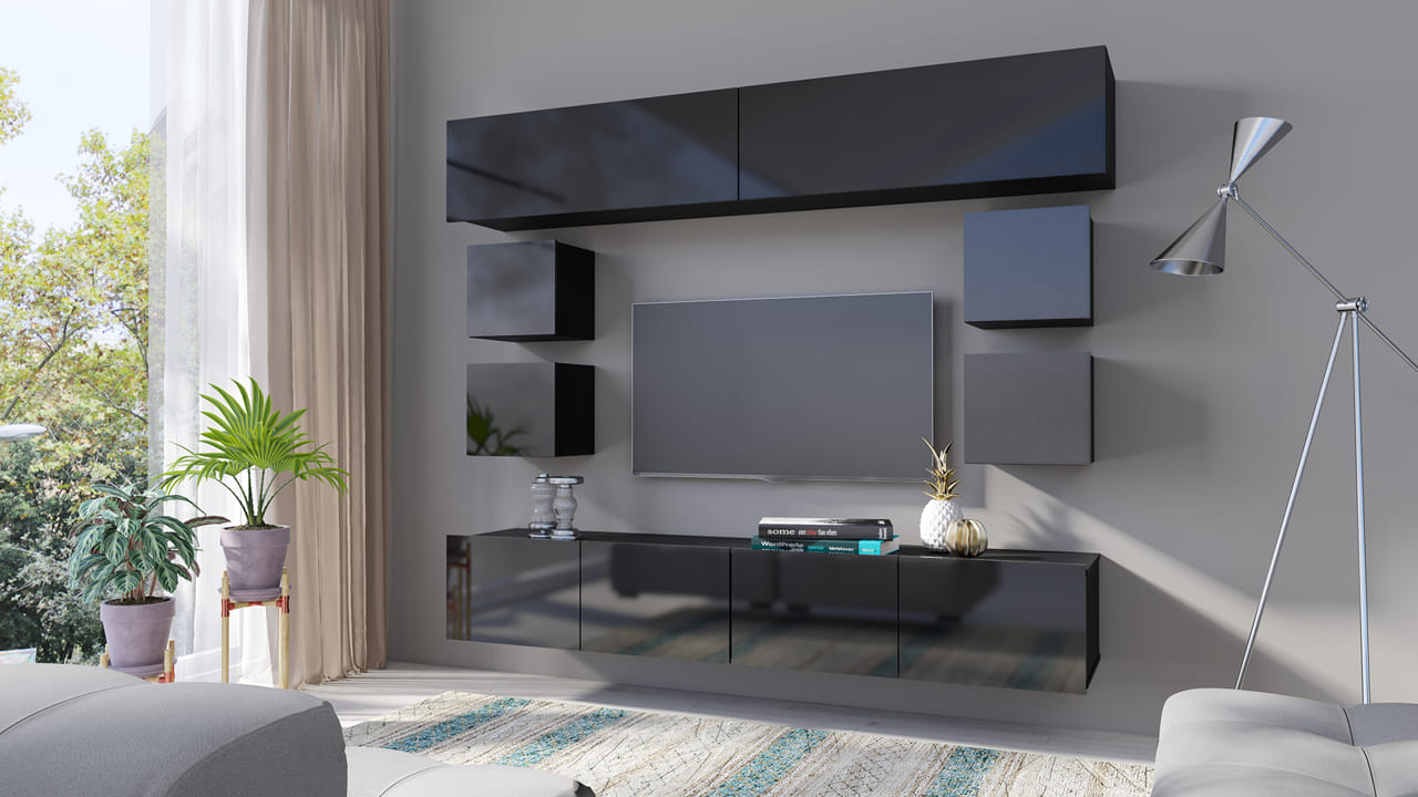 Meblościanka składa się z dwóch szafek RTV o szerokości 100cm, dwóch szafek wiszących poziomych oraz czterech kwadratów.